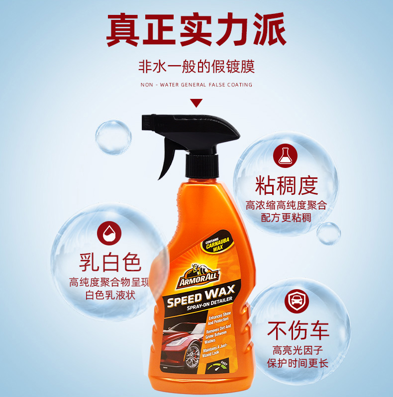 这款Armor All 牛魔王 汽车闪亮手喷蜡/镀膜剂,规格:500mL,美国原装进口,SEET技术,镀膜驱水二合一,涂层轻薄隐形,光滑炫亮,驱水耐脏,各色适用,高浓缩高纯度聚合物配方更粘稠,呈白色乳液状,高亮光因子,不伤车,保护时间更长,液体手喷,快速镀膜,长效90天。
