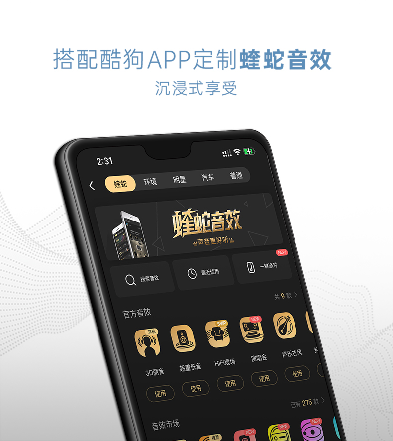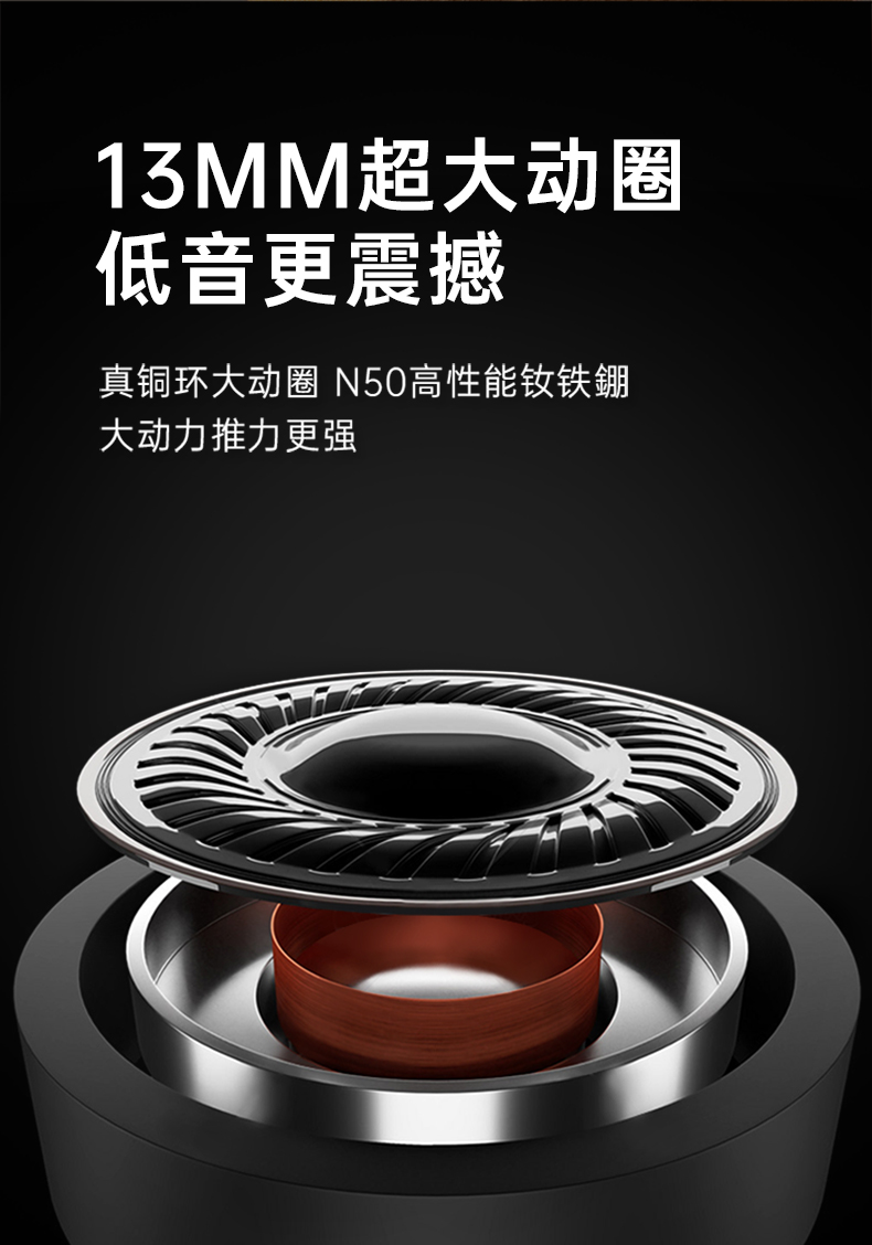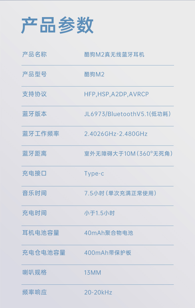 这款酷狗的蓝牙耳机使用蓝牙5.1芯片,连接快速、稳定。使用13mm动圈单元+N50高性能钕铁硼的组合,音质纯净无杂音、低音清晰有力,搭配酷狗定制的蝰蛇音效,带来沉浸式的音质享受。