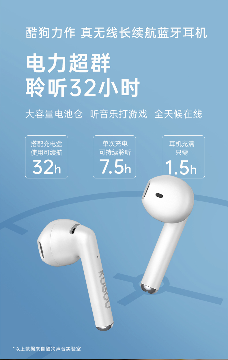 耳机符合人体工学的半入耳式,能更好的贴合耳廓,不挤压更稳固,跑步、旅途也能安心佩戴,单耳机续航长达7.5小时,搭配充电仓的续航长达32小时,充满电只需要1.5小时,使用超省心。