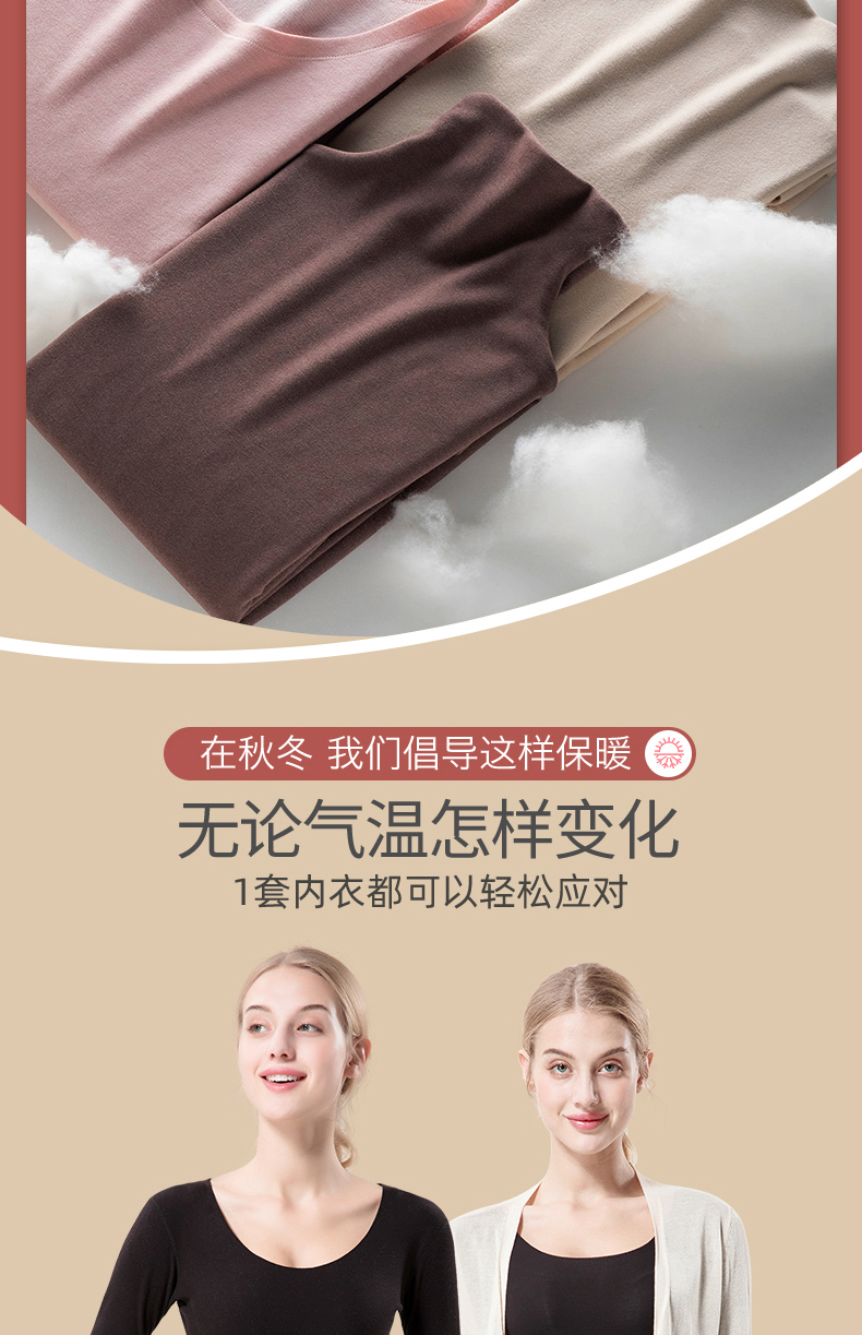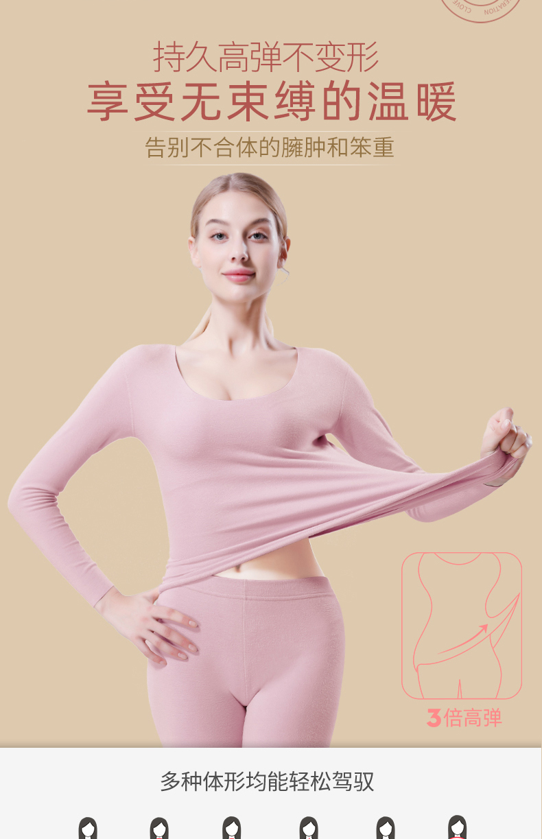 这款保暖内衣,面料材质成分: 粘胶纤维(粘纤)48.8% 聚丙烯腈纤维(腈纶)22.5% 棉20.3% 聚氨酯弹性纤维(氨纶)8.4%四种纤维混纺,面料有着比棉更柔软的触感,且吸湿性好,穿着透气舒适,不易起皱,双面磨绒处理贴身穿着保暖更舒适;