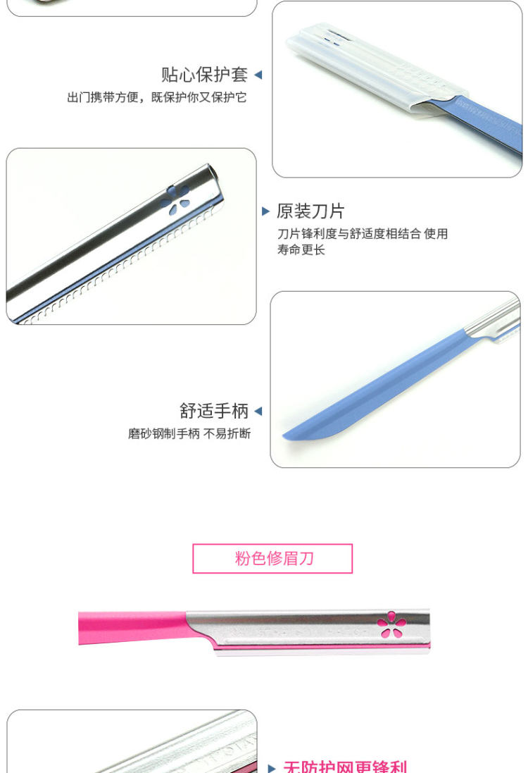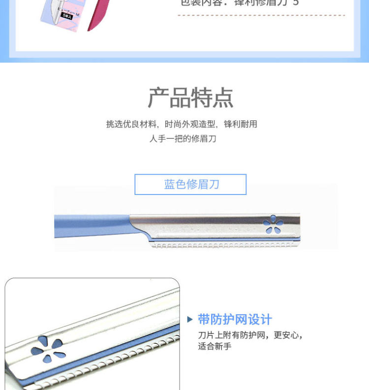 初学者修眉刀5把装,轻松收纳刀头,网文刮感温和,聚合物表面涂层处理,避免刮伤肌肤,刀柄防滑设计,握感舒适易操作。赠运费险。