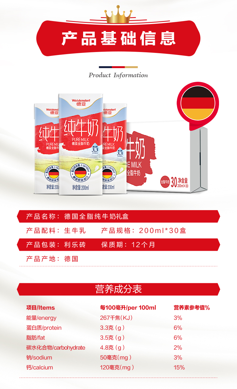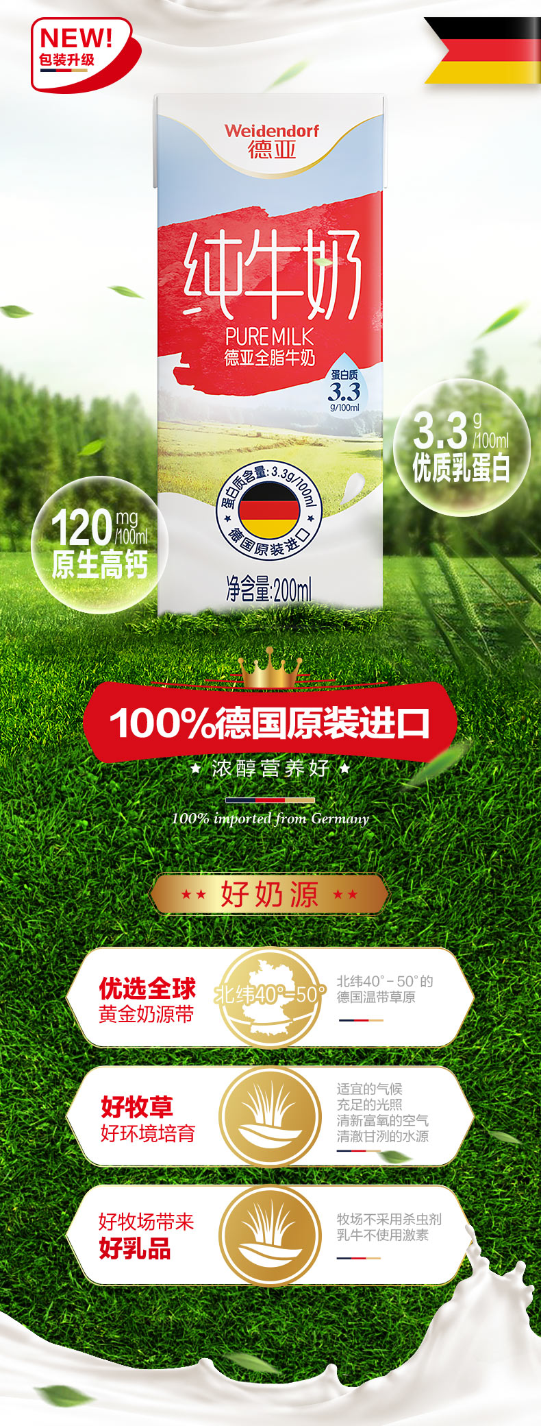 Weidendorf德亚是品利公司的自有品牌,是一家正规的进口食品进口商和经销商,其奶源采自澳大利亚和德国两地。德亚牛奶由德国知名奶产品厂商Hochwald 好沃德代工生产,商品拥有国家颁发的“出入境检验检疫卫生证书”和“中国人民共和国进口货物报关单”。