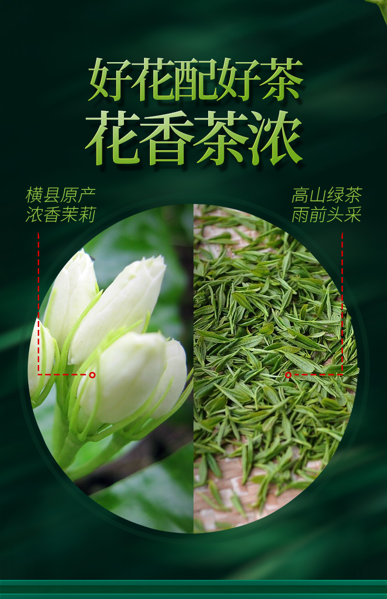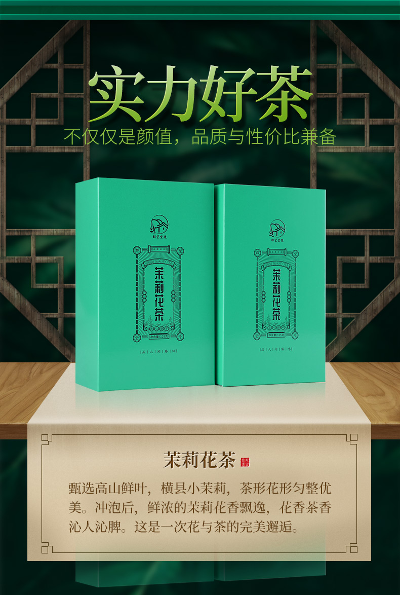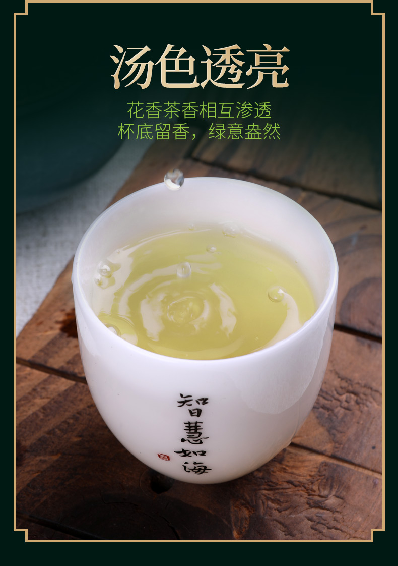 这款郡望堂号正宗茉莉花茶,特级浓香型,选用横县原产浓香茉莉和高山绿茶,茶形花形匀整优美、白毫密布。冲泡后,鲜浓的茉莉花香飘逸,花香茶香相互渗透,沁人沁脾,这是花与茶的完美邂逅,口感醇正顺滑。