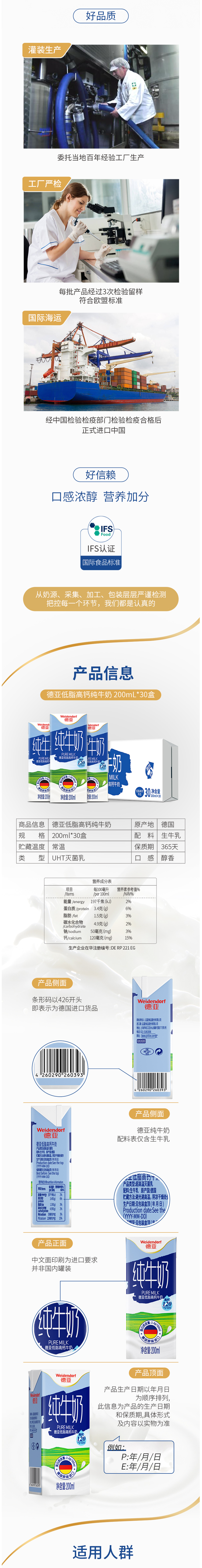 德国原装进口牛奶,乳源来自南北纬40~50°的温带草原德国莱茵河畔牧场里的奶牛,奶香纯正浓郁,采用欧洲先进脱脂技术,脂肪含量减少50%,钙含量124mg/100ml,脂肪含量1.5g/100ml,蛋白质含量3.4g/100ml,高钙低脂更易吸收。并经IFS认证,从奶源、加工到包装一系列溯源把控,食用健康安全。