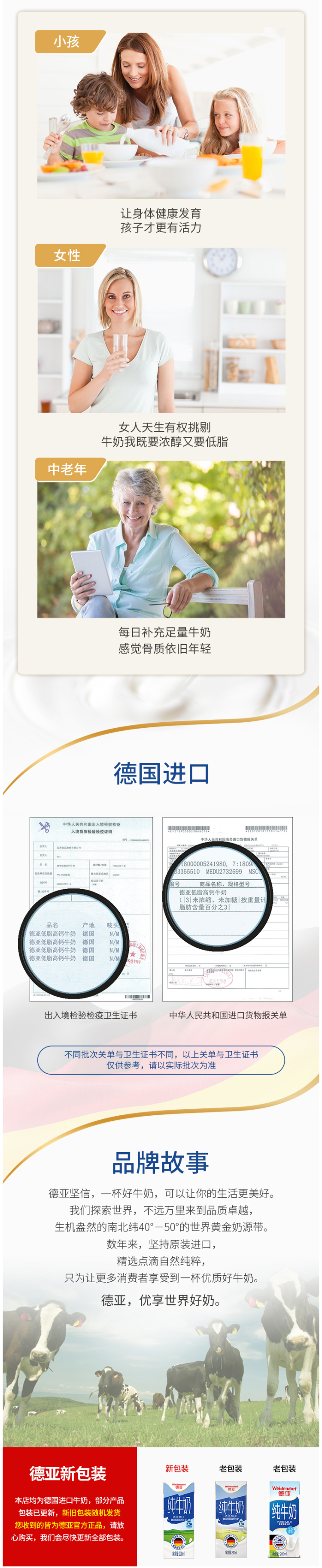 德亚牛奶由德国知名奶产品厂商Hochwald 好沃德代工生产,商品拥有国家颁发的“出入境检验检疫卫生证书”和“中国人民共和国进口货物报关单”。