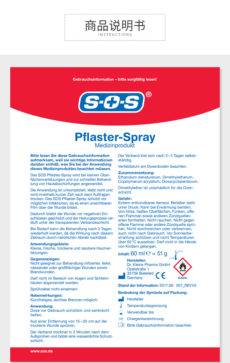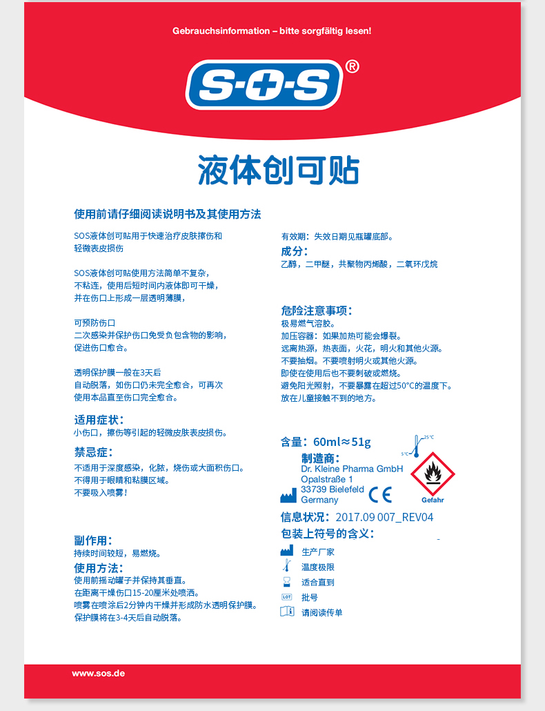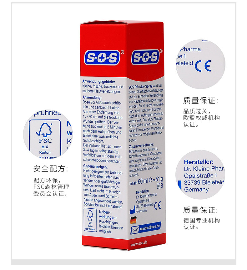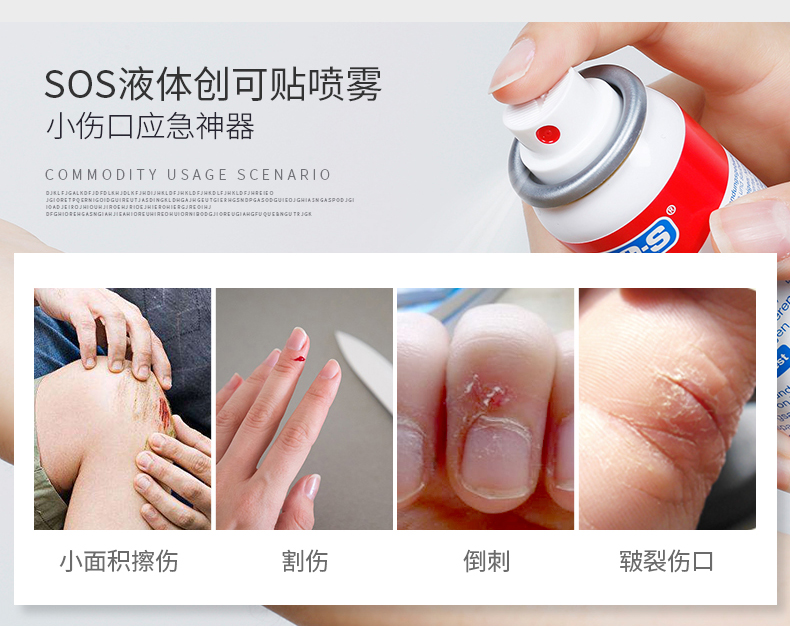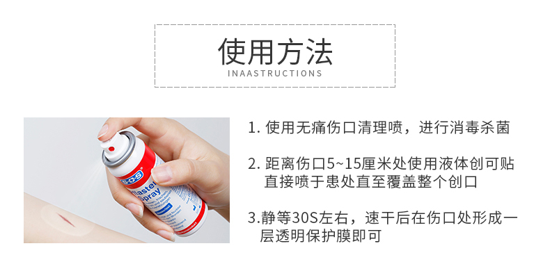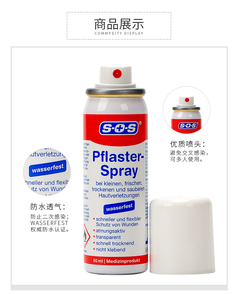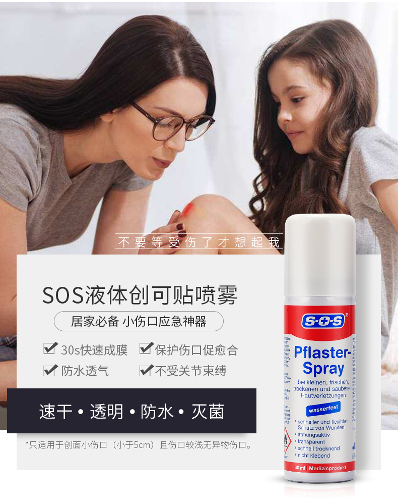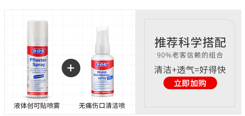 德国国民药妆品牌SOS,欧盟地区家庭长期信赖的护理类品牌,产品的覆盖率达到95%。SOS液体创口贴,液体喷雾胶(Pflaster-Spray),喷雾设计避免交叉感染,喷后伤口处快速形成防护膜。防水抗菌,物理消炎,不易脱落,延展性好,可以长久保护。产品主要成分:乙醚,丙烯酸酯共聚物,二甲醚等,适用所有人群的一般性表皮破损出血等外伤。