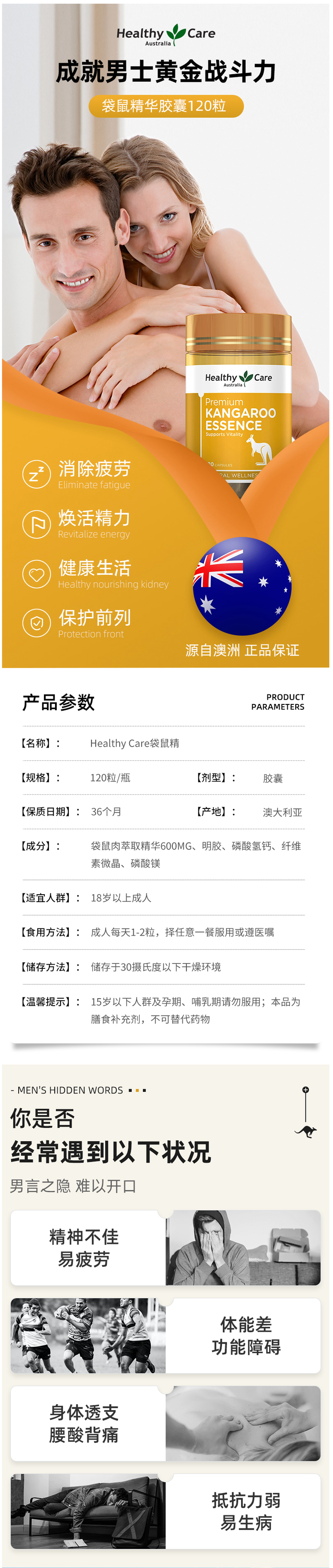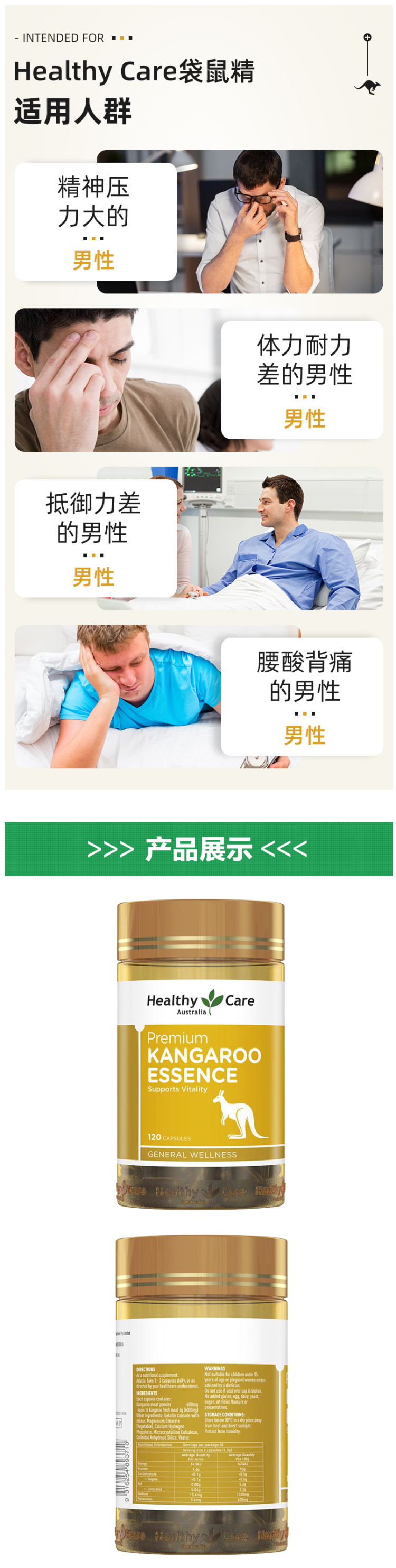 可温补肾虚、提高性机能、提高精子活力、改善生理疲劳、等男性多种性功能障碍问题,被誉为"男性至宝"。每粒胶囊袋鼠精含量600mg,袋鼠肉精华80%,规格:120粒,成人每日1-2粒,不适合15岁以下或怀孕、哺乳期妇女。