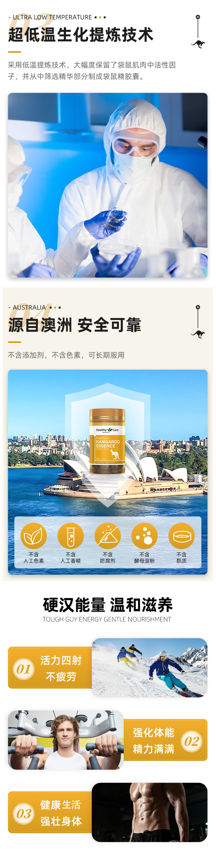 澳大利亚的袋鼠以红袋鼠最为著名,以其强壮的体魄、超常的生殖能力,被誉为“袋鼠王中之王”。以红袋鼠为肌肉原料,萃取的有效成分生物活性强,不含人工添加剂,无激素,为纯天然的男性滋养保健用品。