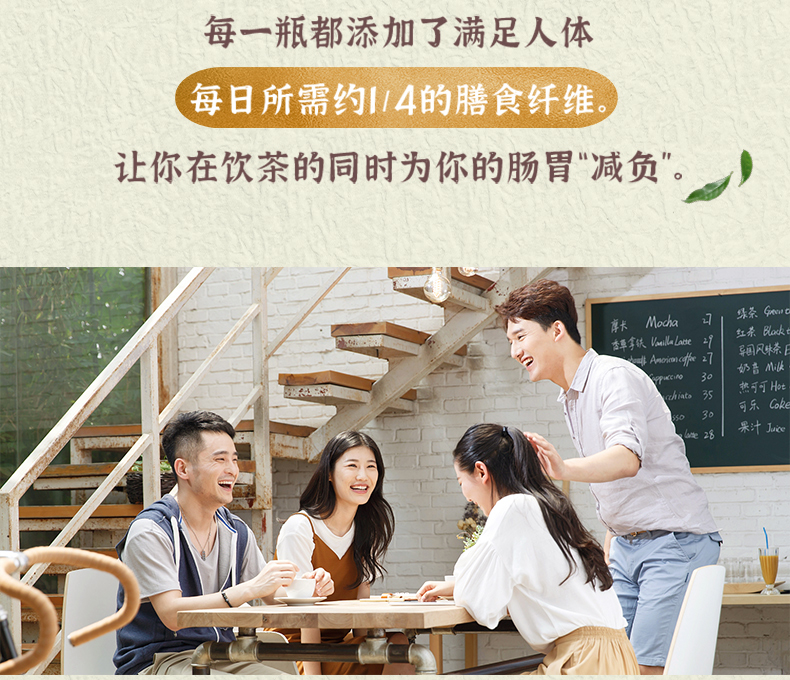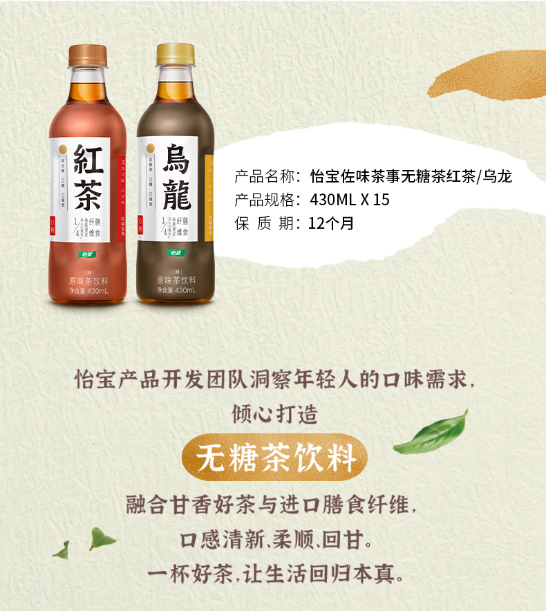 怡宝出品的0糖0脂茶饮料,优选精致好茶,口感清新、柔顺、回甘,每瓶内含成年人每日所需1/4的膳食纤维,在饮茶的同时为肠胃减负,促进胃肠蠕动,保持身体健康。