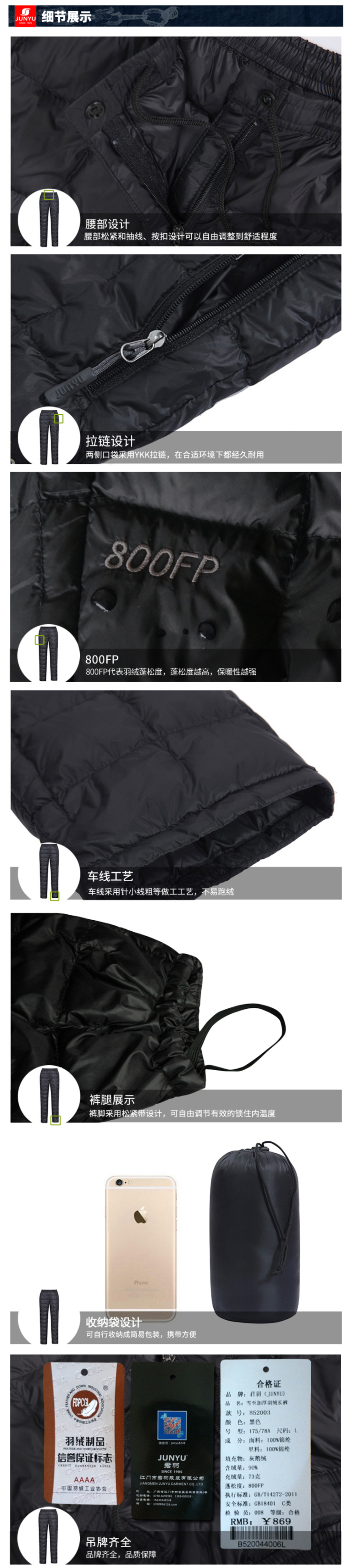 这款君羽男女羽绒裤,外层是日本东丽20D高密尼龙面料,防风防泼水,内里填充800蓬90%鹅绒,常规款充绒量55克,厚款充绒量73克,可以穿的轻便又暖和。