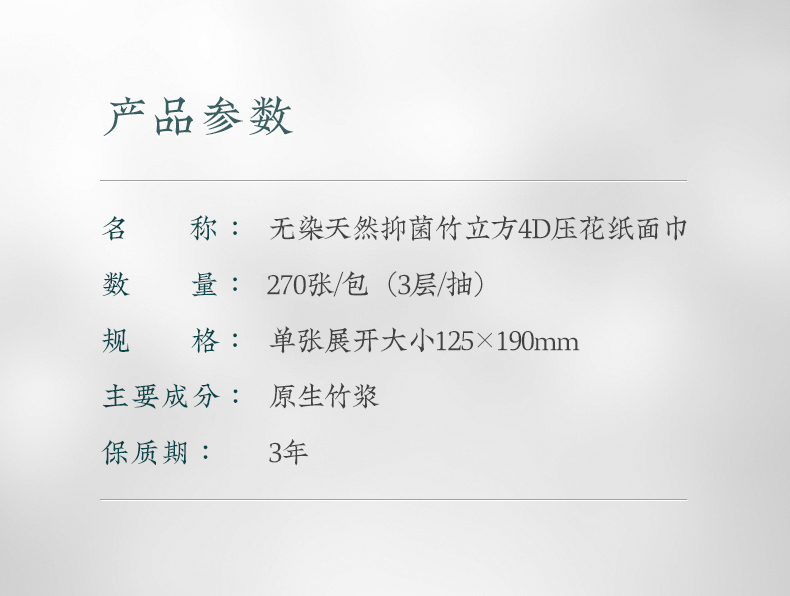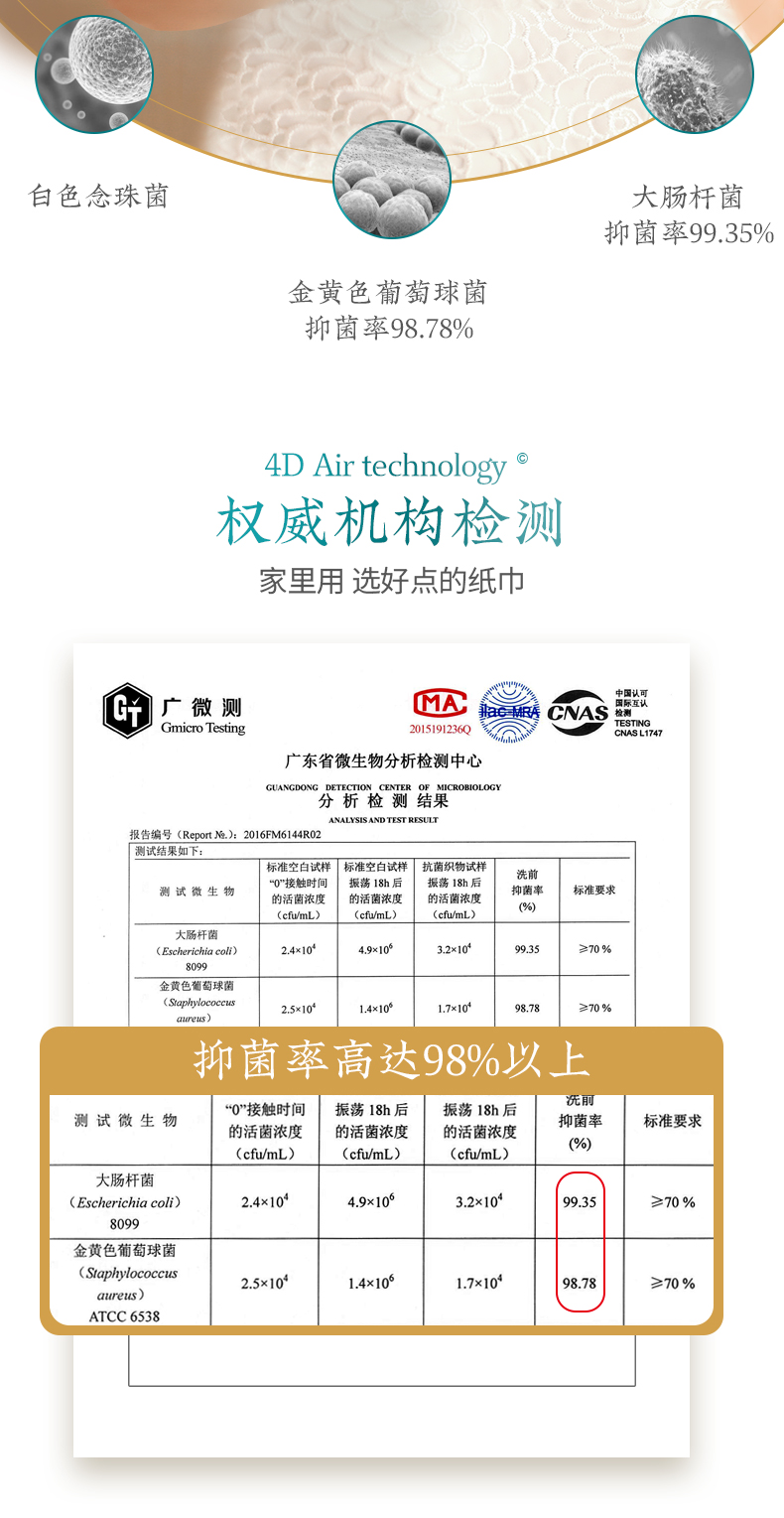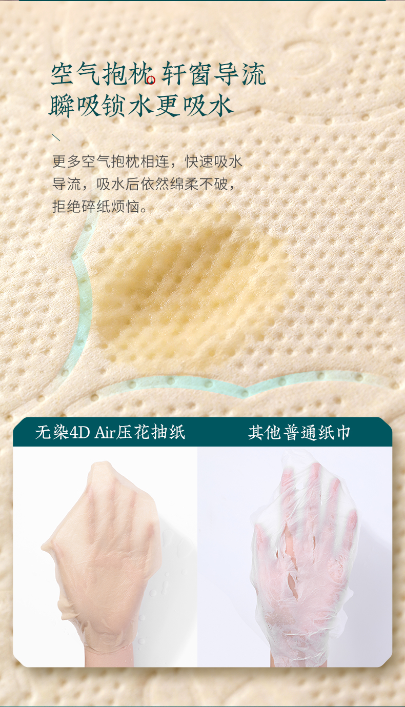 这款抽纸无漂白,无有害添加,抽纸可直接接触食品,内部添加天然提取的竹锟精华,抑菌率高达99%,具有多孔纤维,可以瞬间吸收和蒸发水分,湿水后韧性更强,擦拭后不易松散,干湿两用,卸妆洗脸均可。