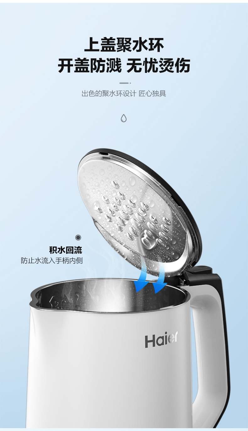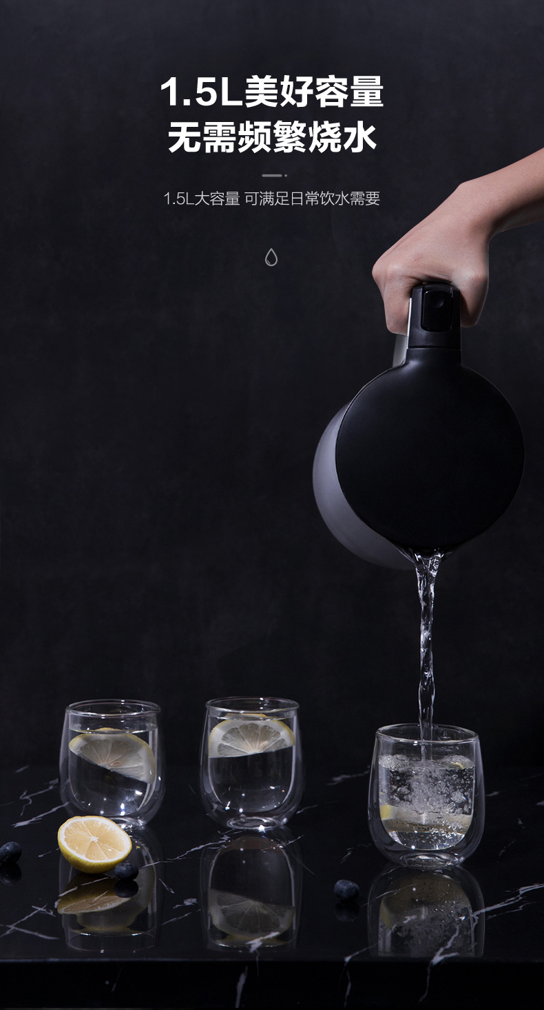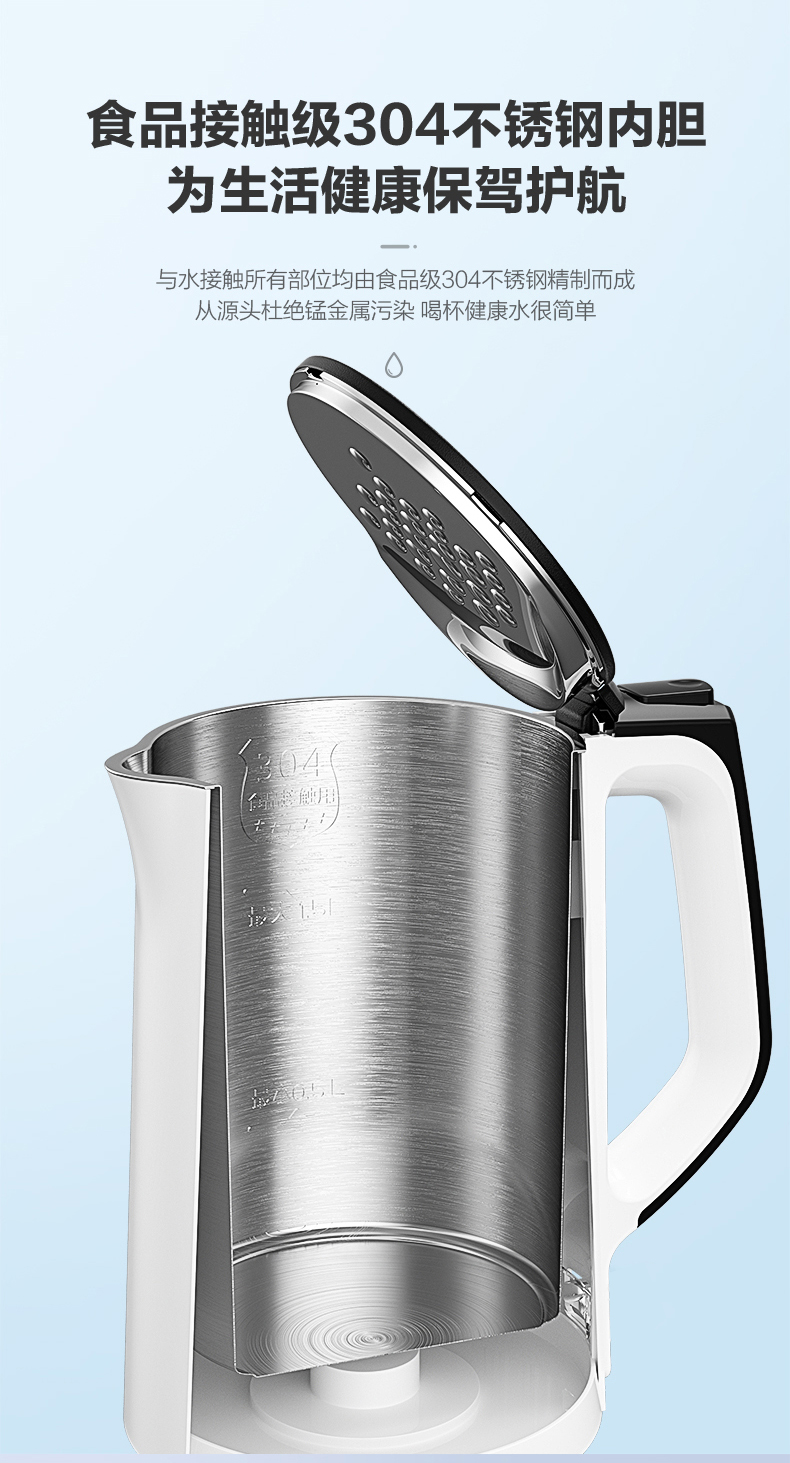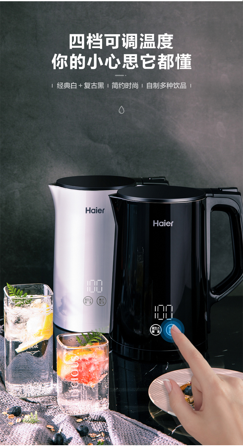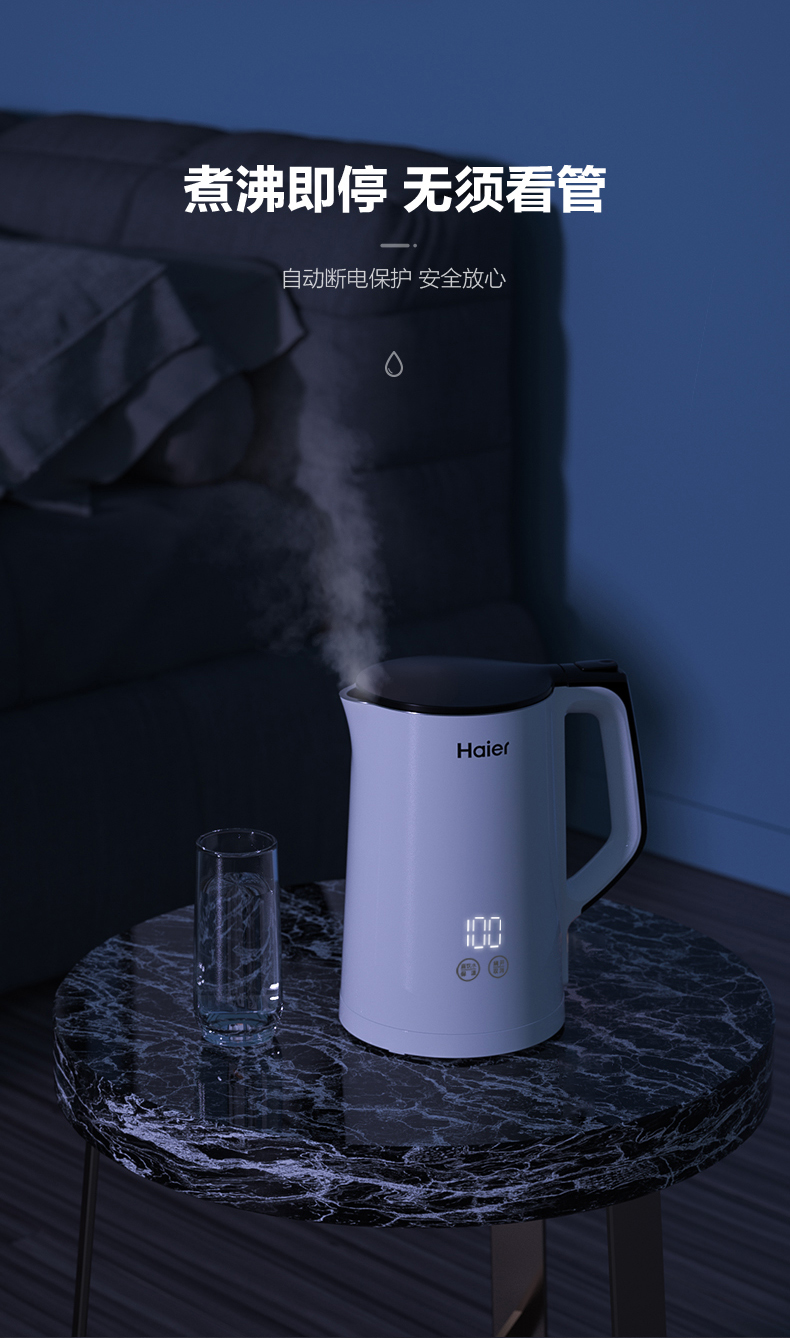 这款海尔双层防烫电热水壶,容量是1.5L,功率是2200W,与水接触的所有部位都是304不锈钢制成,安全无毒,一体化无缝内胆,不藏水垢,易清洗。