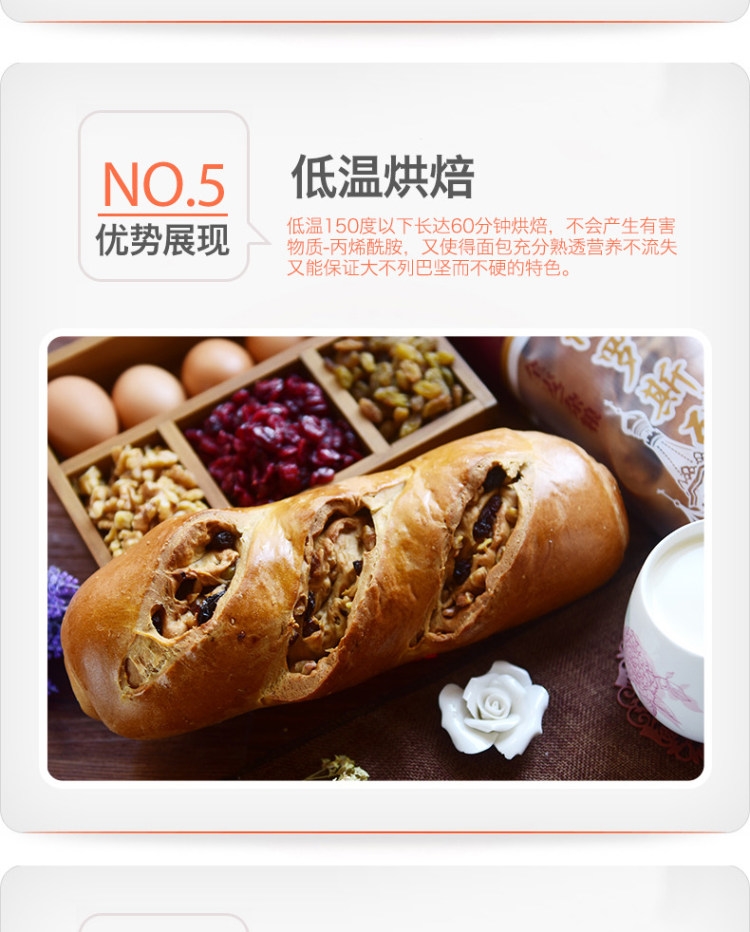 低温三次发酵,使得面包更加紧实,在低温150摄氏度以下长达60分钟烘焙,不会产生有害物质-丙烯酰胺,又使得面包充分熟透,营养不会流失,又能保证大不列巴坚而不硬的特点。