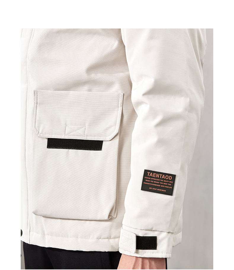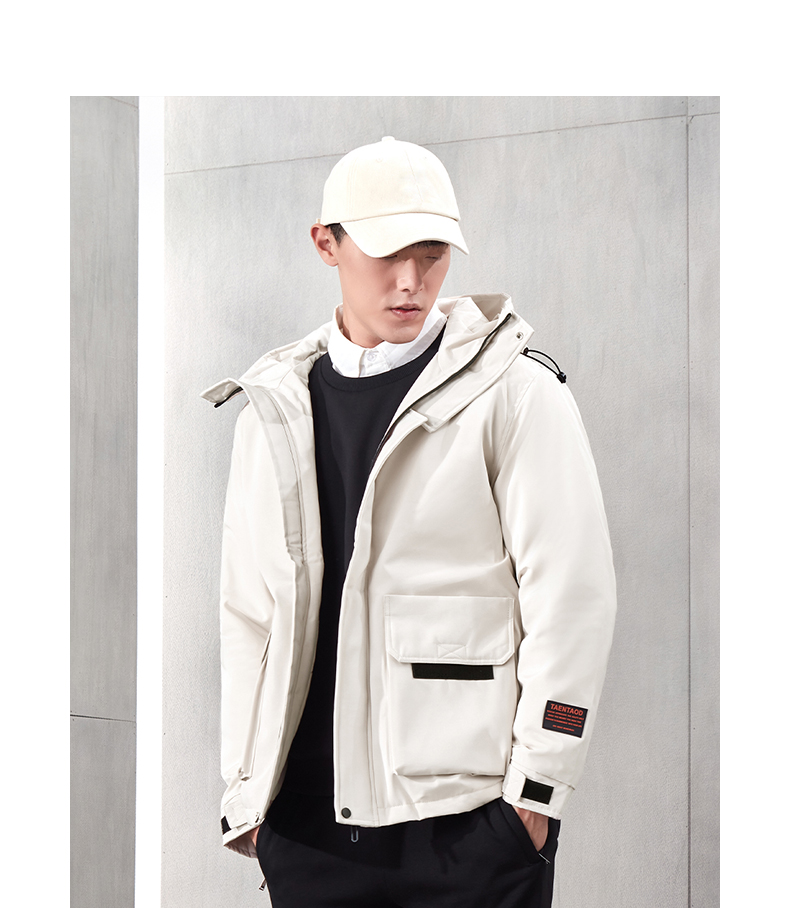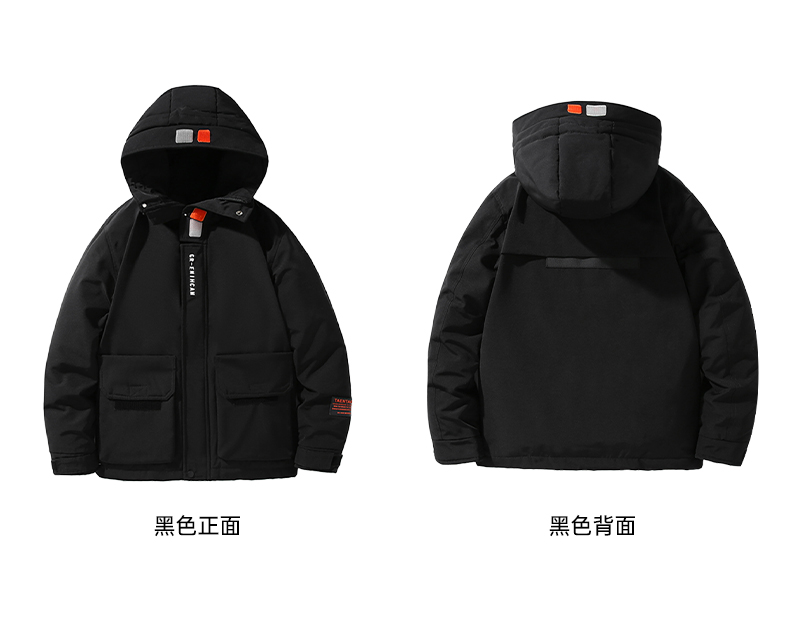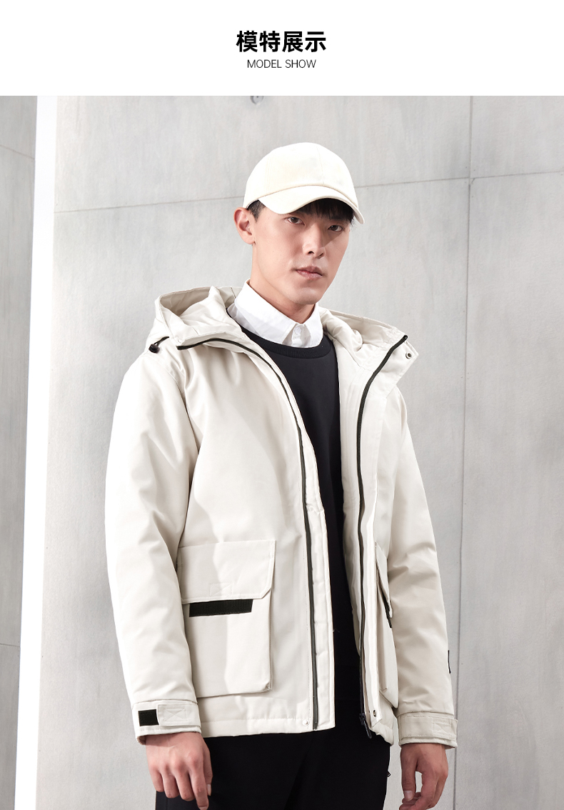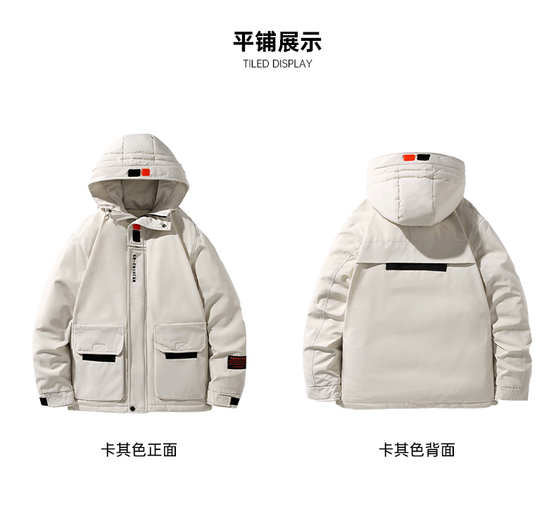 在款式上,休闲户外风,加厚头盔式防风帽,搭配半高衣领,能有效阻止寒风的倒灌;魔术贴袖口,双重门襟,有效保暖;翻盖皮瓣口袋,置物安全。