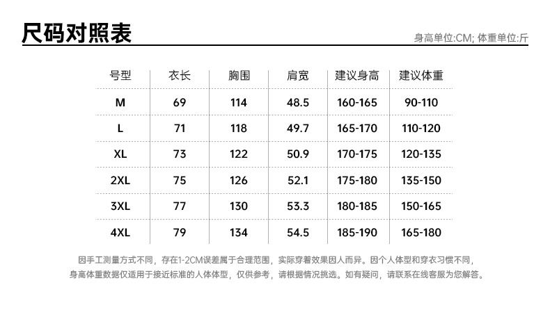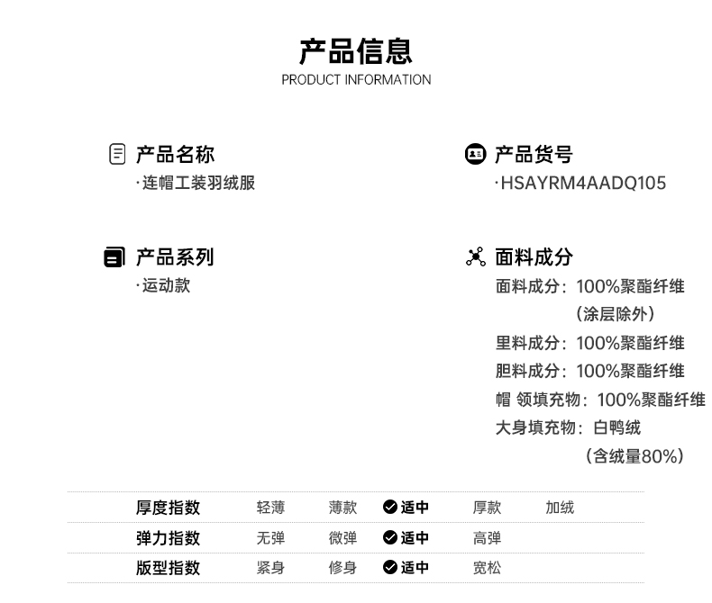 具体充绒量:M码 90g、L码 100g、XL码 110g、XXL码 120g、XXXL码 130g、XXXXL码 140g