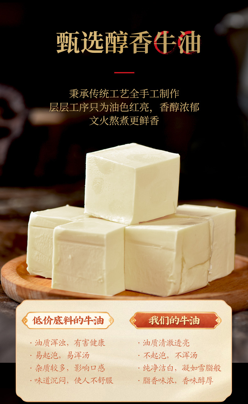 采用优质牛油,香味纯粹,消融后明澈透明,再加入内黄新一代a辣椒、茂汶花椒、郫县豆瓣酱,香味浓郁,使得火锅底汤的色、香、麻、辣、鲜俱全味,秋冬季节最适合吃火锅了,爱吃辣的可以一小小的囤一波。