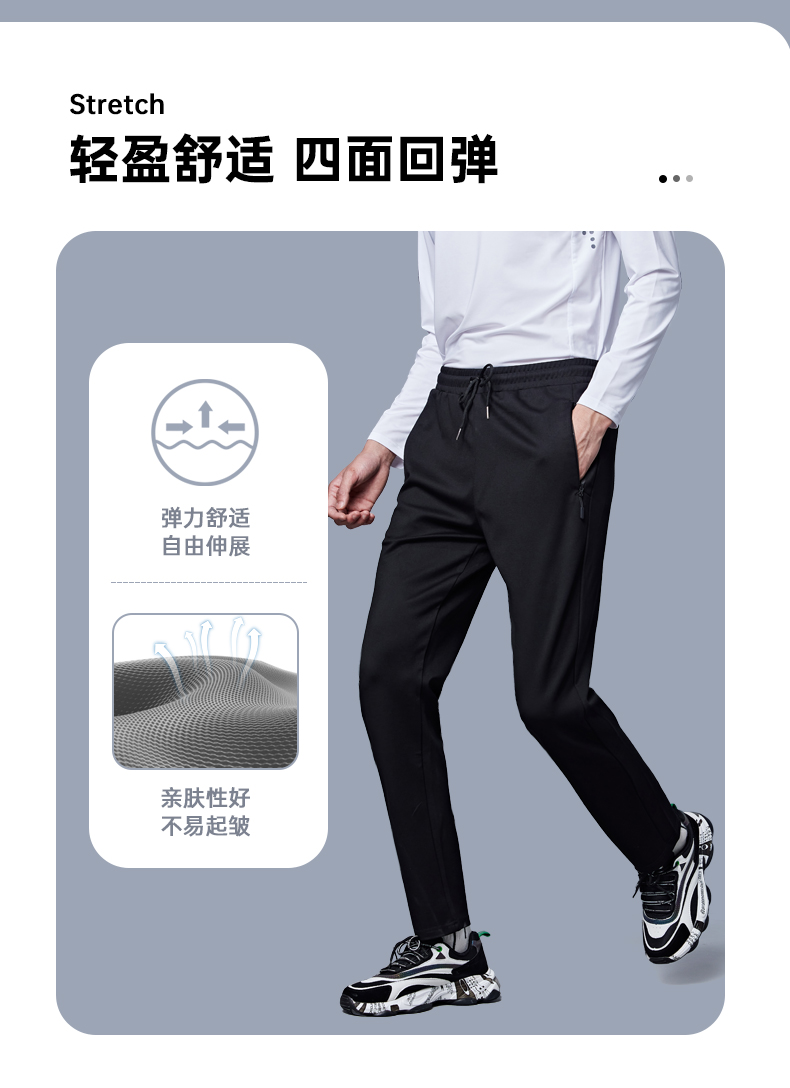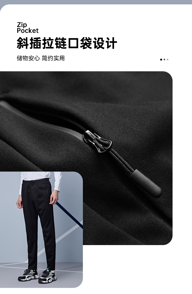 在款式上,标准版型,弹力松紧裤腰配抽绳,穿脱方便,两侧插袋有拉链,置物更安全,裤脚走线平整流畅。还特别经过抗静电处理,避免秋冬季的静电响和吸附灰尘。