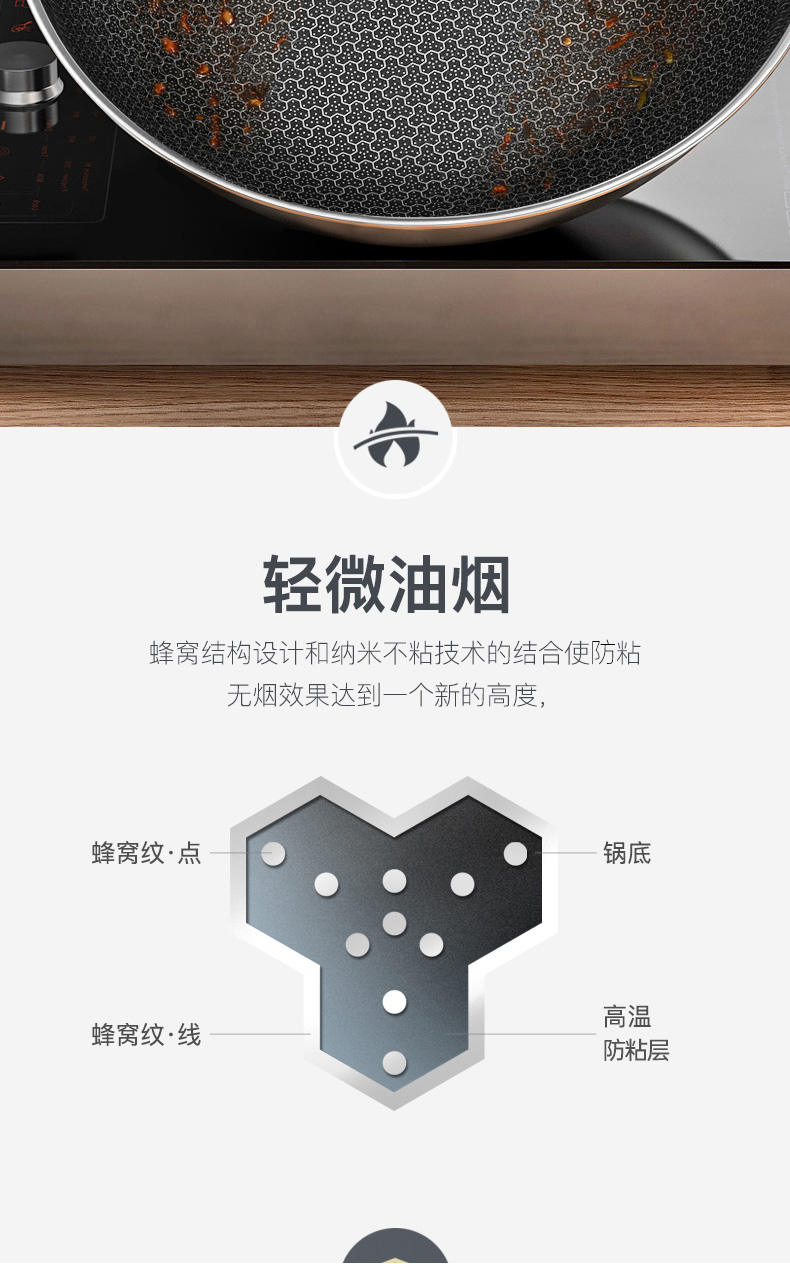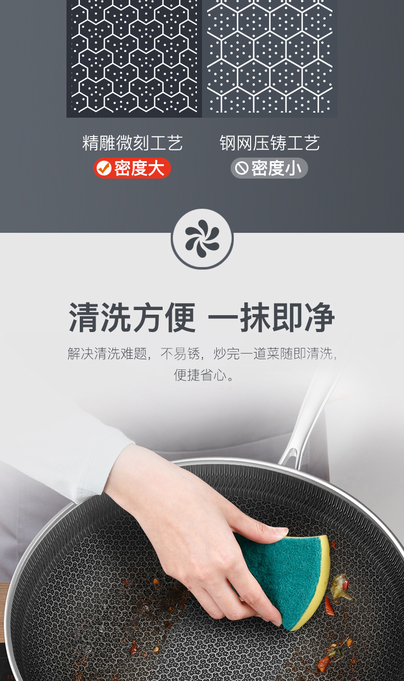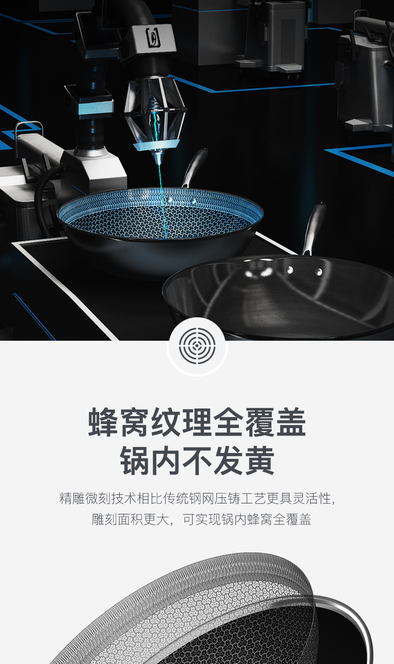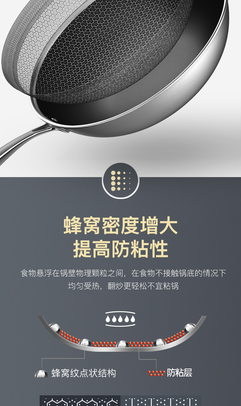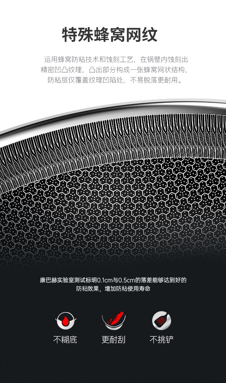 锅体内壁是运用高精微刻技术的特殊蜂窝网纹,蜂窝凹凸花纹均匀加热,减少食材与锅底的接触面积,从而达到不易粘效果,比化学涂层的更安全。