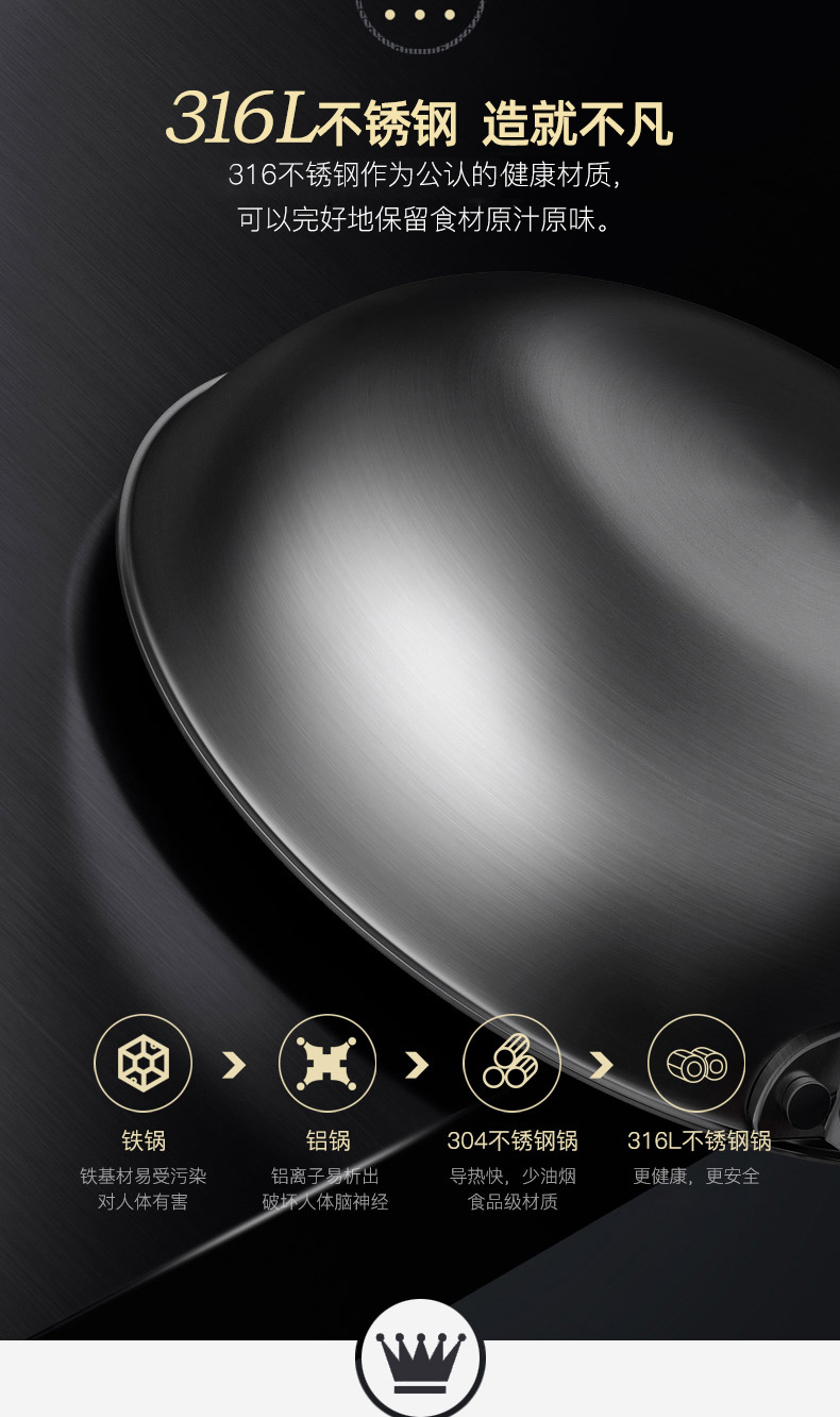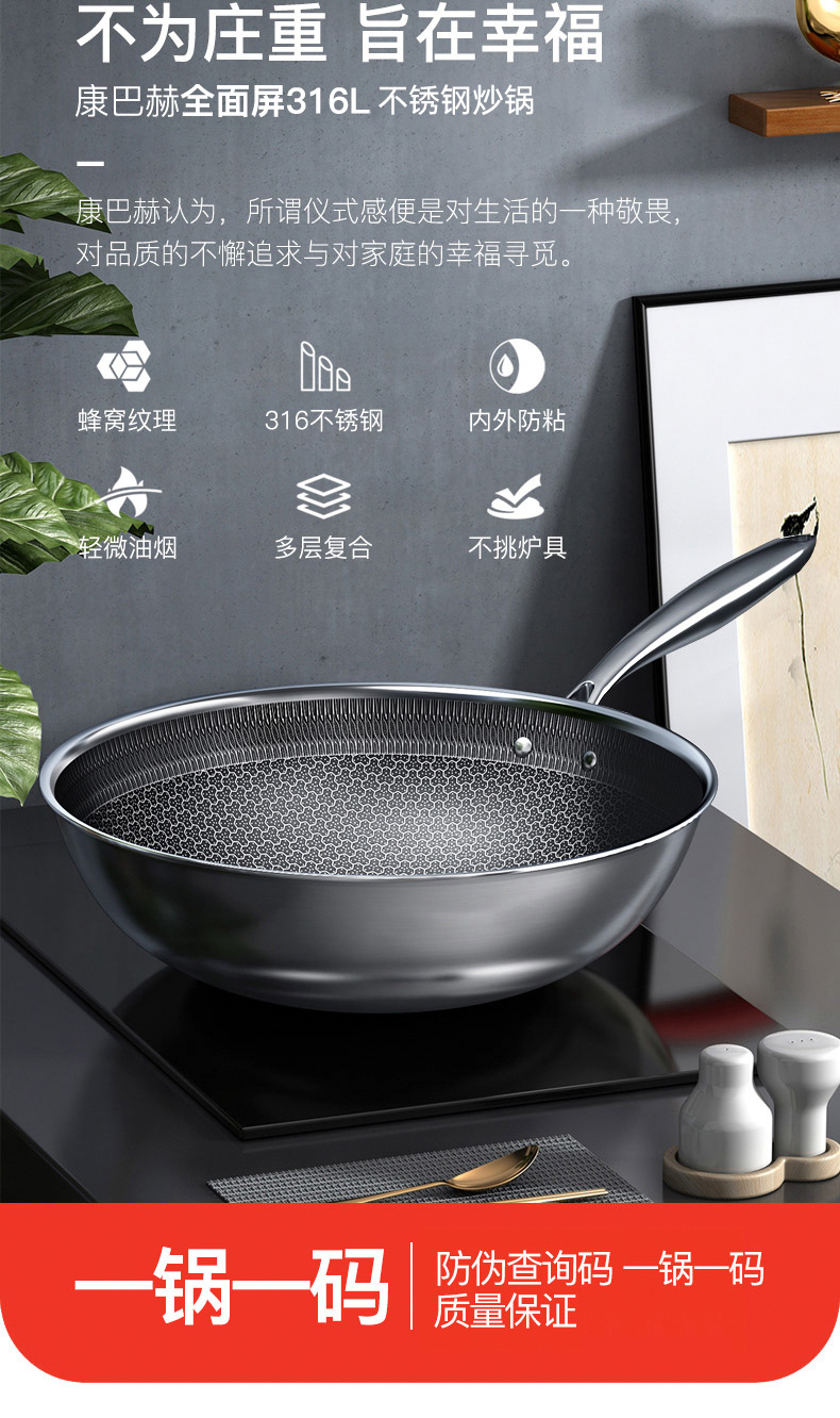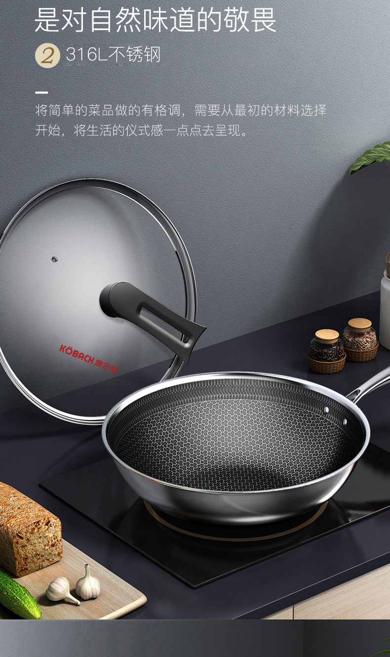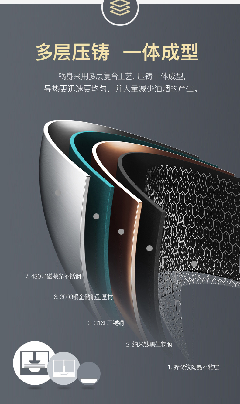这款康巴赫第三代炒锅,锅身主体是采用比304不锈钢性能更加稳定的食品级316不锈钢,多层复合一体冲压成型,更坚固耐用、导热更迅速更均匀。分别是蜂窝网状层、水性防粘层、316L不锈钢、高热能纯铝合金、430导磁抛光不锈钢。