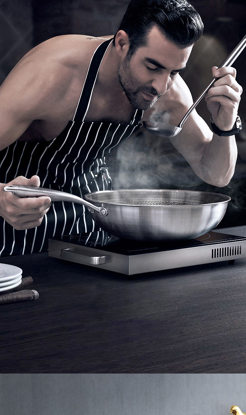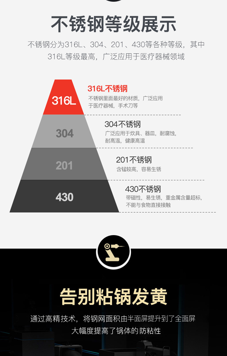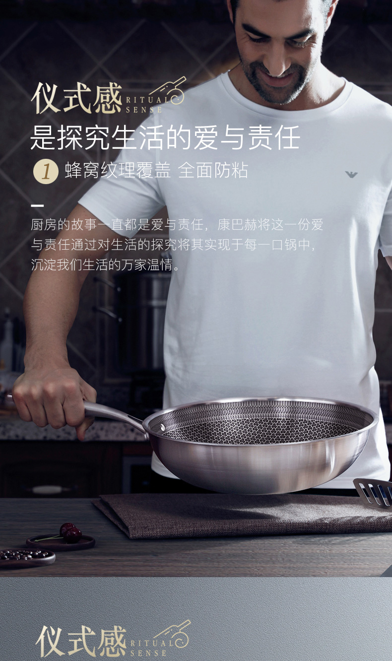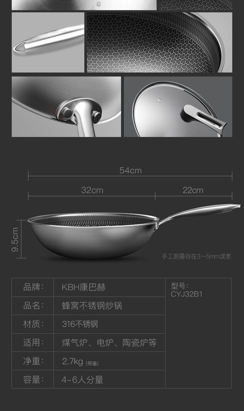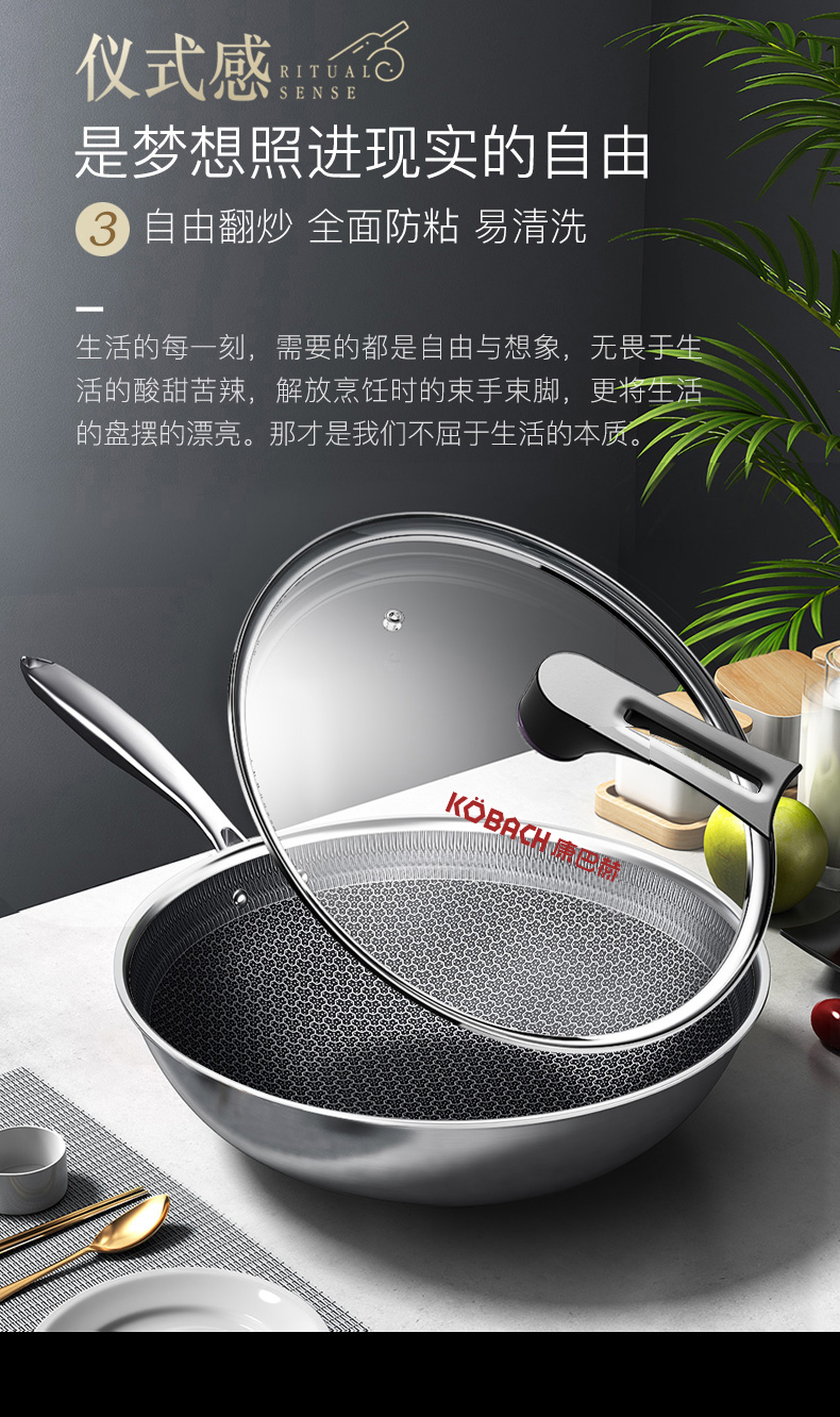 这款康巴赫第三代炒锅,锅身主体是采用比304不锈钢性能更加稳定的食品级316不锈钢,多层复合一体冲压成型,更坚固耐用、导热更迅速更均匀。分别是蜂窝网状层、水性防粘层、316L不锈钢、高热能纯铝合金、430导磁抛光不锈钢。