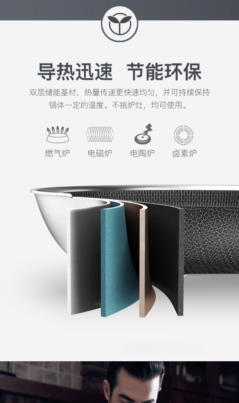 复合锅底,煤气炉、电炉、陶瓷炉都能使用,锅身直径32cm、深9cm、净重2.8kg,手柄处还特设隔热防滑套。