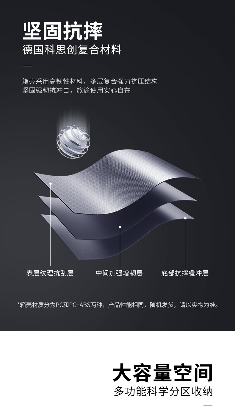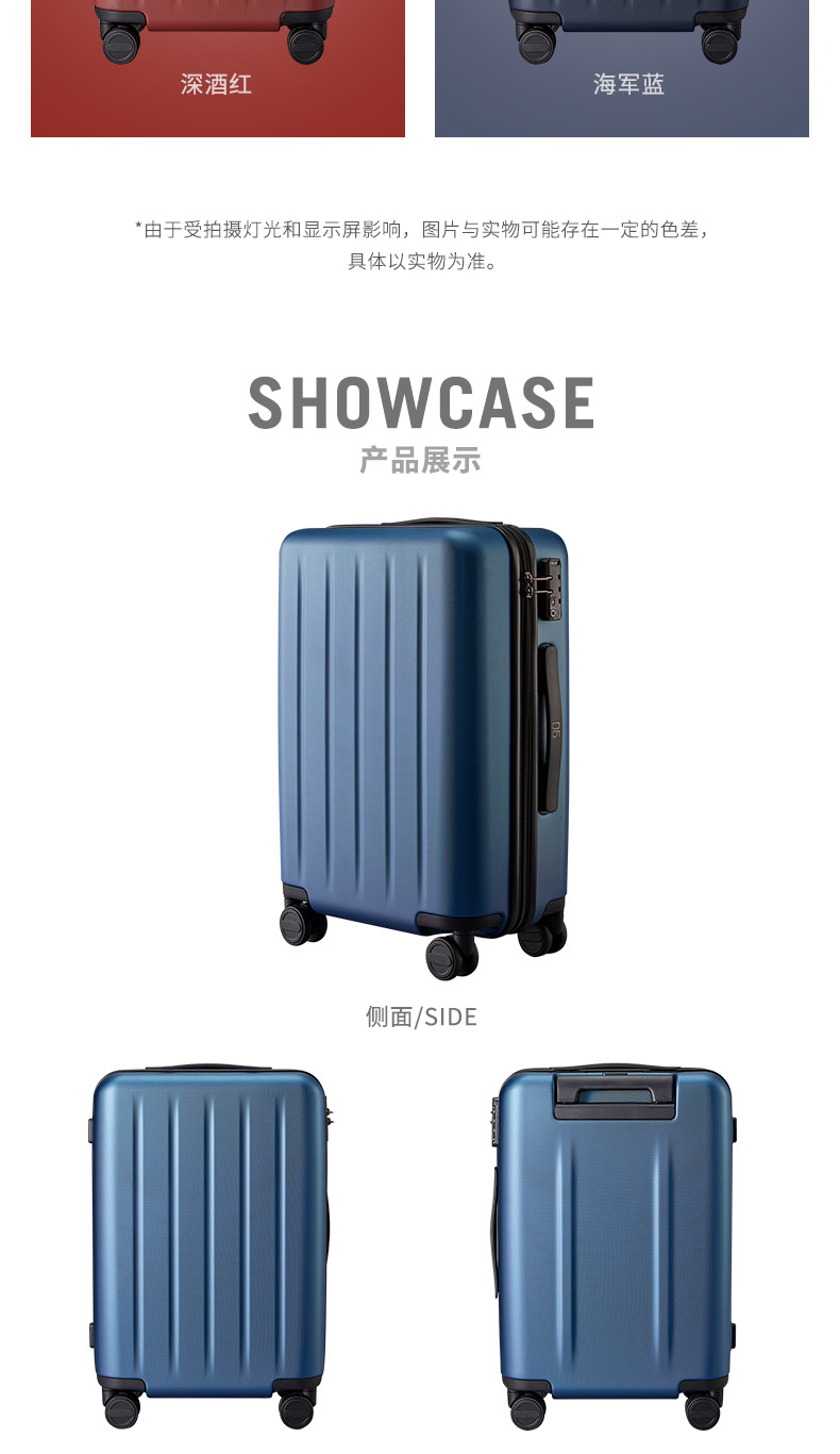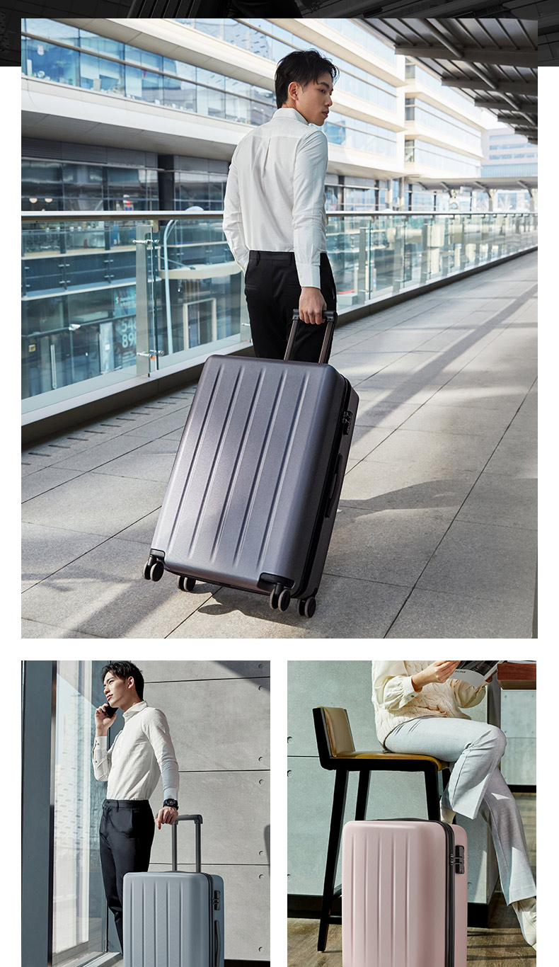 小米旗下 90分拉杆箱,箱体采用3层德国进口的拜耳PC材质,比一般的PC+ABS材质的强度还要高,3层抗压,使表面更耐磨,而且具有出色的回弹性,即使被遭受强硬的外部压力,也不易变形,表面蜂窝圆点设计,不易被刮花,双面均有竖条纹凹槽,给箱体强劲支撑。
