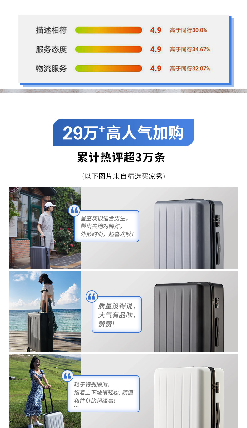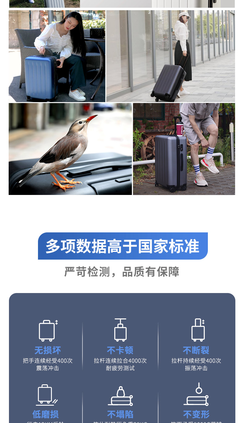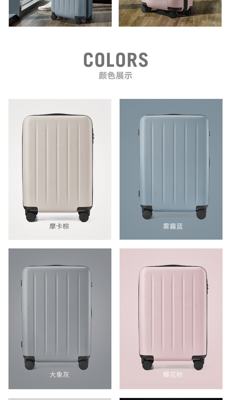 小米旗下 90分拉杆箱,箱体采用3层德国进口的拜耳PC材质,比一般的PC+ABS材质的强度还要高,3层抗压,使表面更耐磨,而且具有出色的回弹性,即使被遭受强硬的外部压力,也不易变形,表面蜂窝圆点设计,不易被刮花,双面均有竖条纹凹槽,给箱体强劲支撑。