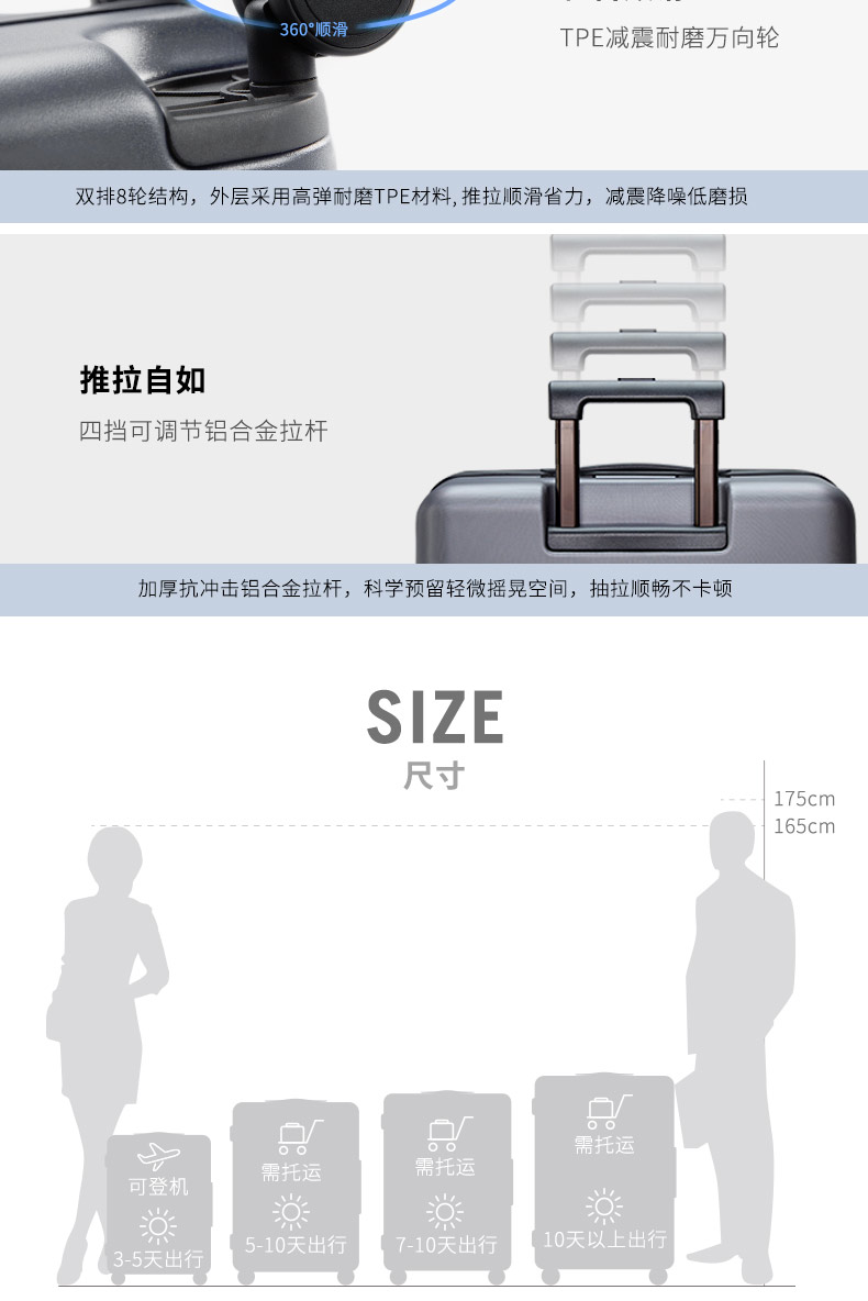 拉杆为4档调节的加厚铝合金材质,使不同身高的人也能轻松使用,表面经过阳极氧化处理,散发着低调的深黑金属光泽,同时加大管壁厚度,从而大幅降低拉杆摇晃幅度,提高了使用寿命,轮胎为高弹TPE材质,静音平顺,轮座与支撑架之间贴合紧密,避免了晃动时的噪音。