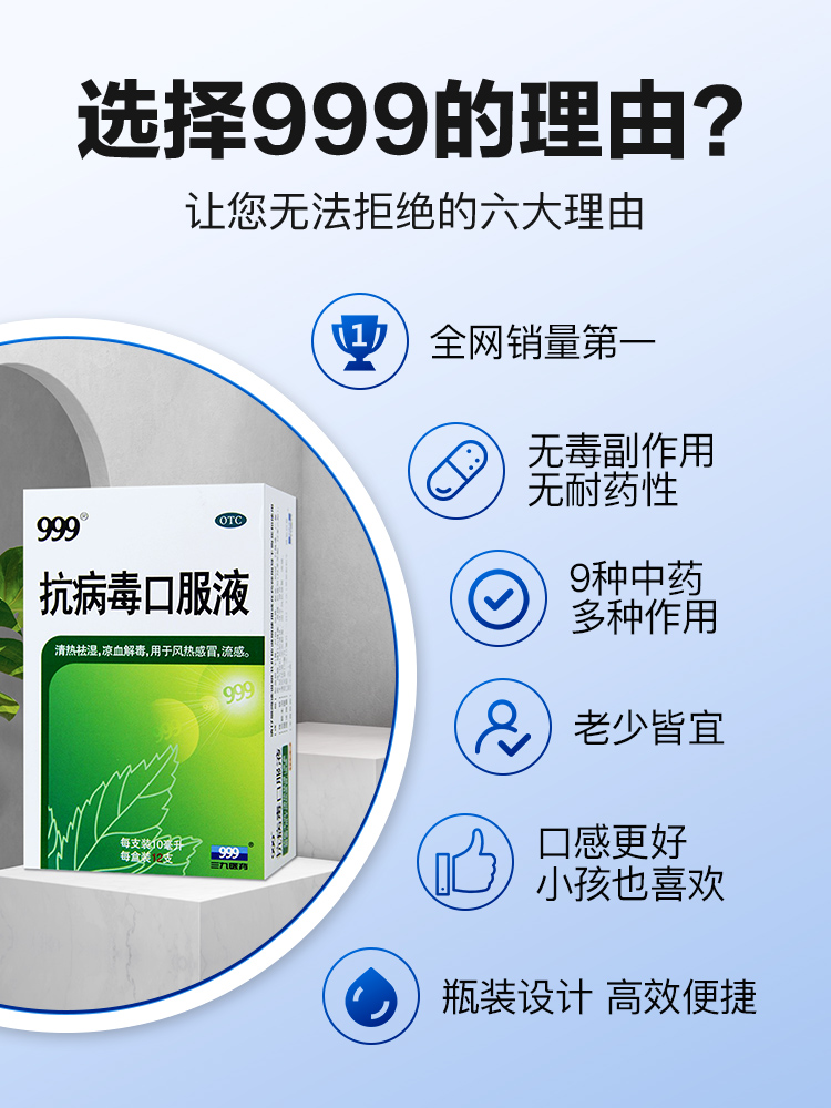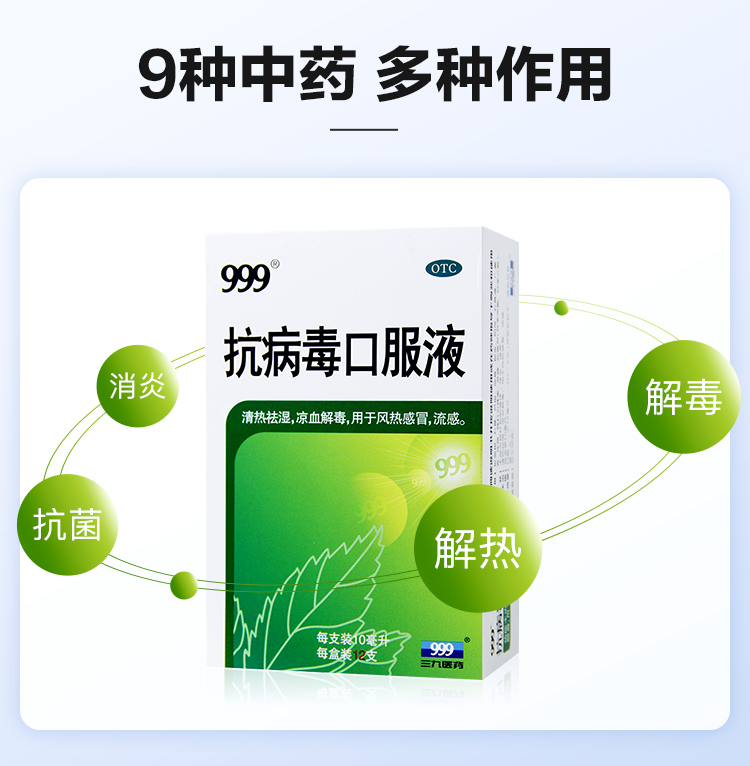 这款999 抗病毒口服液,9种中药复合作用,能清热祛湿、凉血解毒,用于风热感冒、流感。无毒副作用,无耐药性。