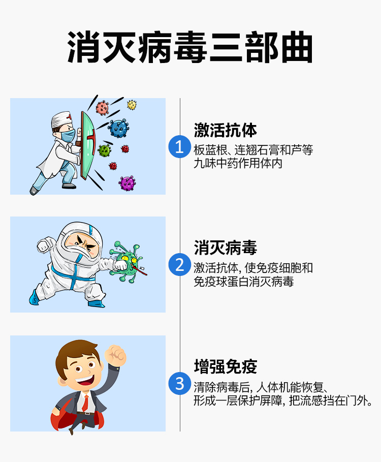 1.激活抗体,板蓝根、连翘石膏和芦等九味中药作用体内消灭病毒