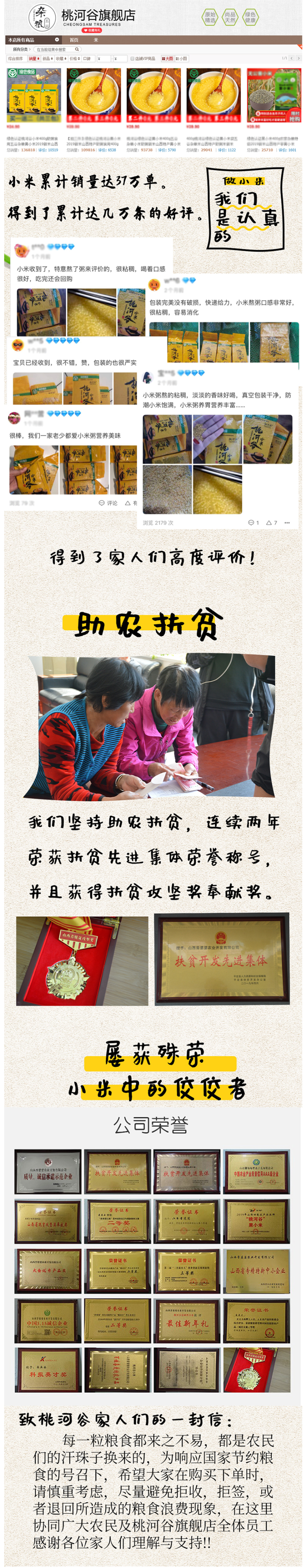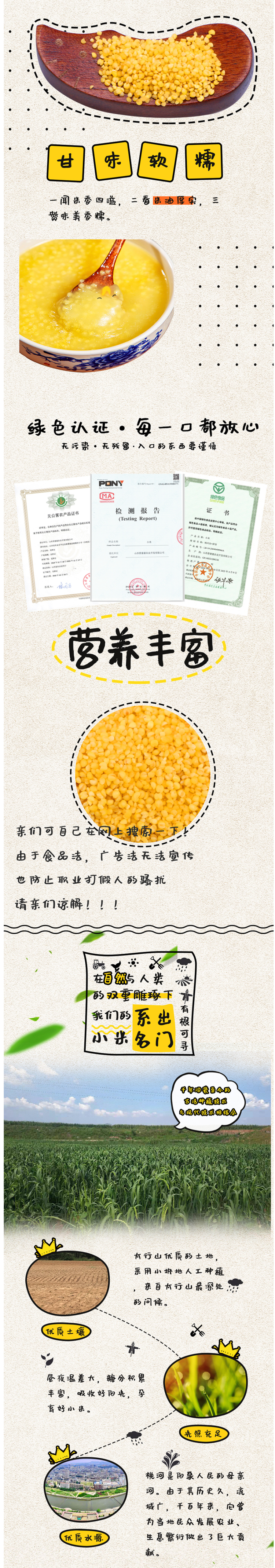 这款桃河谷黄小米,是2020年的新米,由于21年的秋季还没到,所以20年的米就是新米。春种秋收,一年一季,人工种植收割,在种植过程中不使用农药、化肥、激素、除草剂、防腐剂等化学物质,经过绿色食品认证。