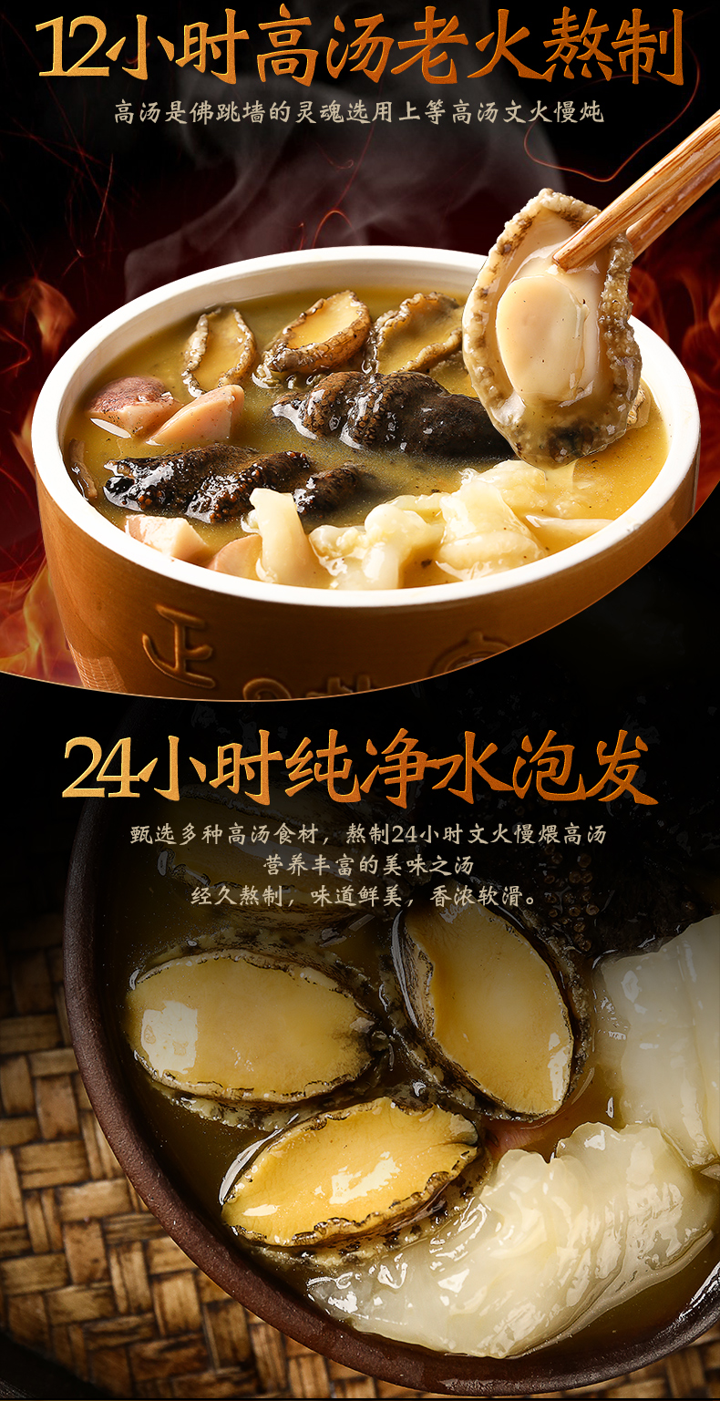 绝世 佛跳墙,精选鲍鱼、海参、瑶柱、蚌丝、花菇、鱼唇、牛筋、螺肉、蚌肉、鸡肉、猪肉等为原料,使用传统手工烹饪工艺,经过12小时文武火交替熬制而成,绝对是宴会中的压轴菜之一,吃起来软嫩柔润,鲜香浓郁,荤而不腻;各料互为渗透,味中有味,营养价值极高,不含任何防腐剂成分。买回家加热即食即可,非常方便。