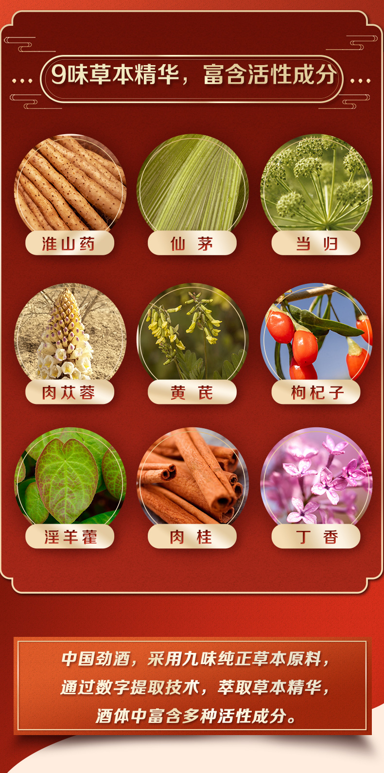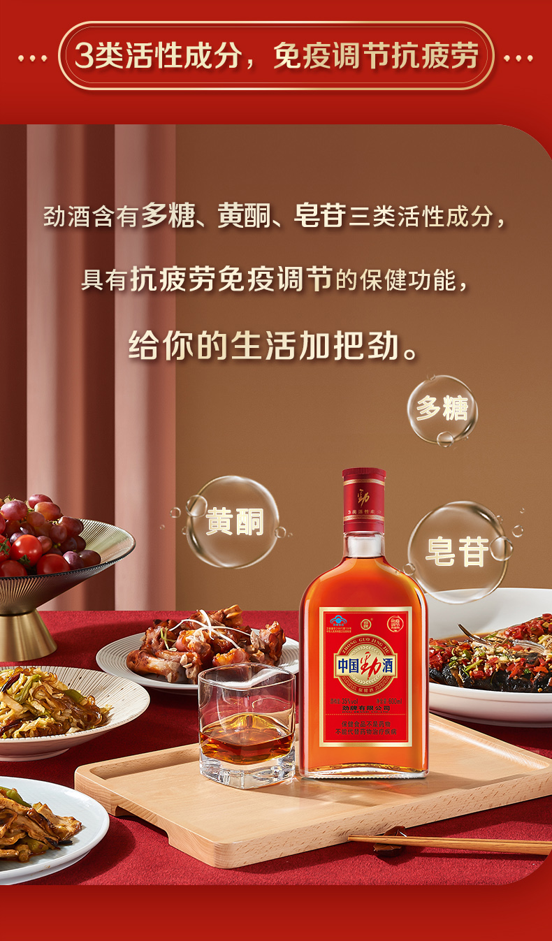 参茸劲酒是劲牌主打的一款功能性保健酒,酒中选用肉苁蓉、仙茅等多种名贵药材,对人体新陈代谢好,同时也是一款强身健体、滋养脾肾,或当做赠礼的养生保健酒,度数35%vol。