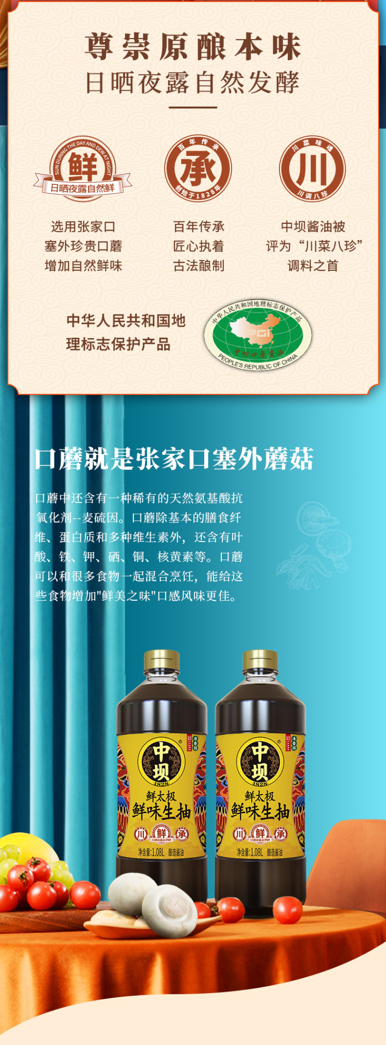 天猫中坝旗舰店39.8元,可领23元优惠券,实付16.8元到手;精选非转基因脱脂大豆,自然发酵180天以上!日晒夜露,自然发酵,浓郁鲜香领券链接点此