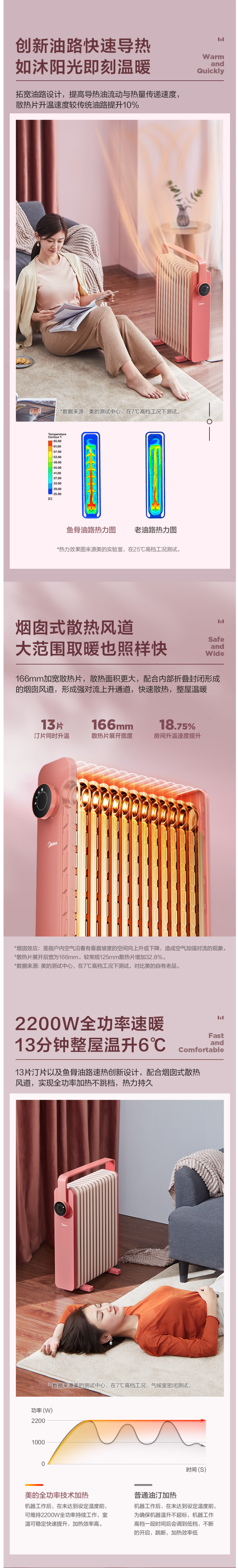 这款美的电热油汀取暖器,166mm加宽油汀片,13片油汀同时升温,创新鱼骨油路速热设计,配合烟囱散热风道,散热面积更大,提高了热效率,制热速度更快,使用寿命更长。