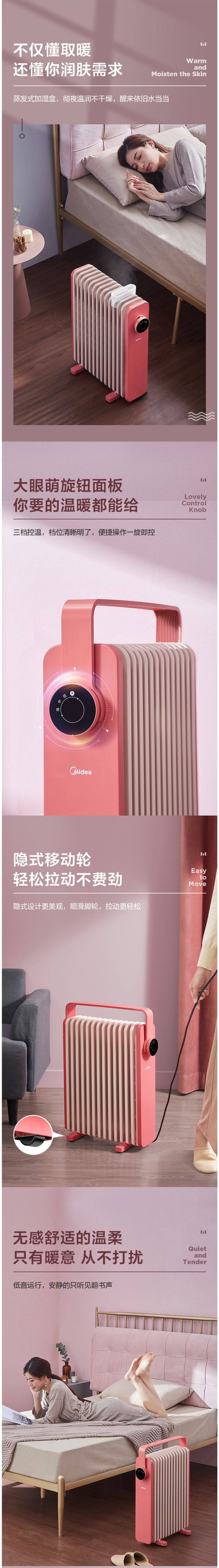 美的大品牌的电热油汀,13片,2200W大功率,去年类似配置的电油汀,至少300+,应季时都能涨到500元以上,冬季需要电热油汀的。一般都是黑白银三色,美的的这款外观做的非常精致,粉嫩的颜色,颜值超高。