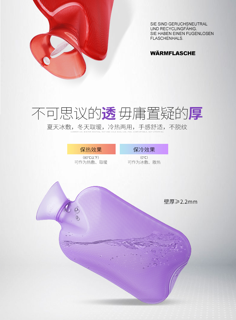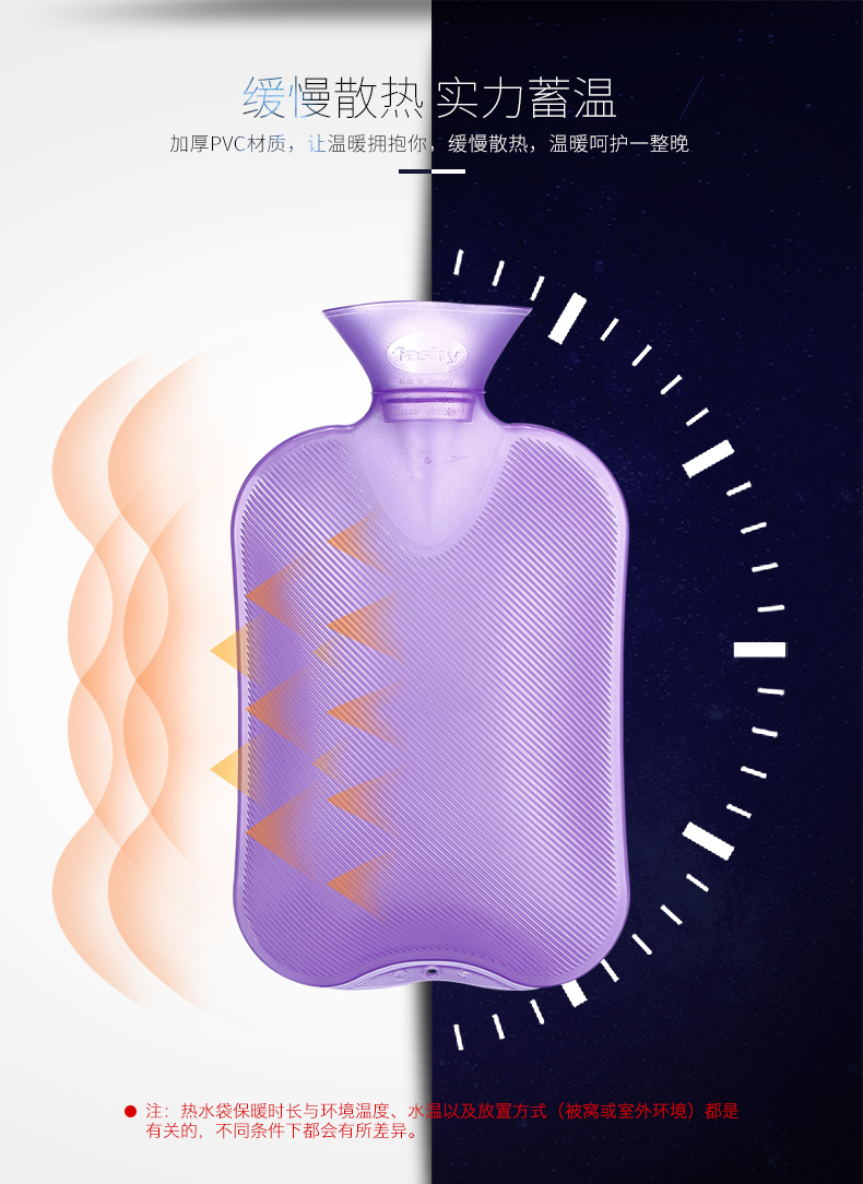 这款费许Fashy热水袋,容量是2L, 除了装热水,还能装冷水。采用德国进口的PVC材质制成,散热均匀,清洗不变形,没有异味,使用寿命长达5-10年;热水袋的外层是格子设计,减滑的同时还可以减少接触面积,提供舒适的温度;