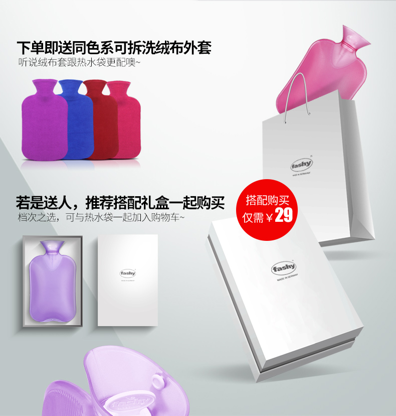 费许“Fashy”是德国的著名保健品品牌「官网地址」,热水袋,热敷包等是旗下明星产品,费许的热水袋都是德国设计德国生产,使用德国TUV安全认证一体成型高密度PVC材质,抗压能力可通过汽车碾压测试,老化速度慢,放在被 窝中缓慢发热可持续7-12小时,晚上放在被 窝中早上水袋还是热的。费许的水袋也可装冷水,在夏季使用。