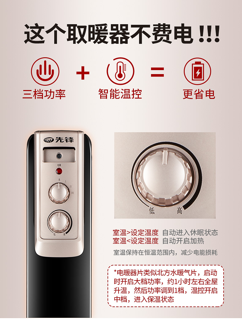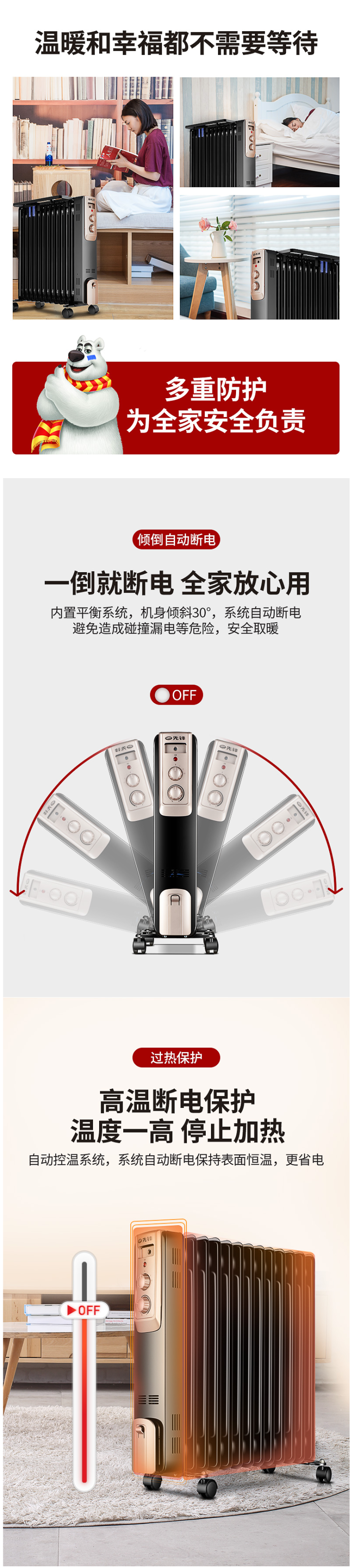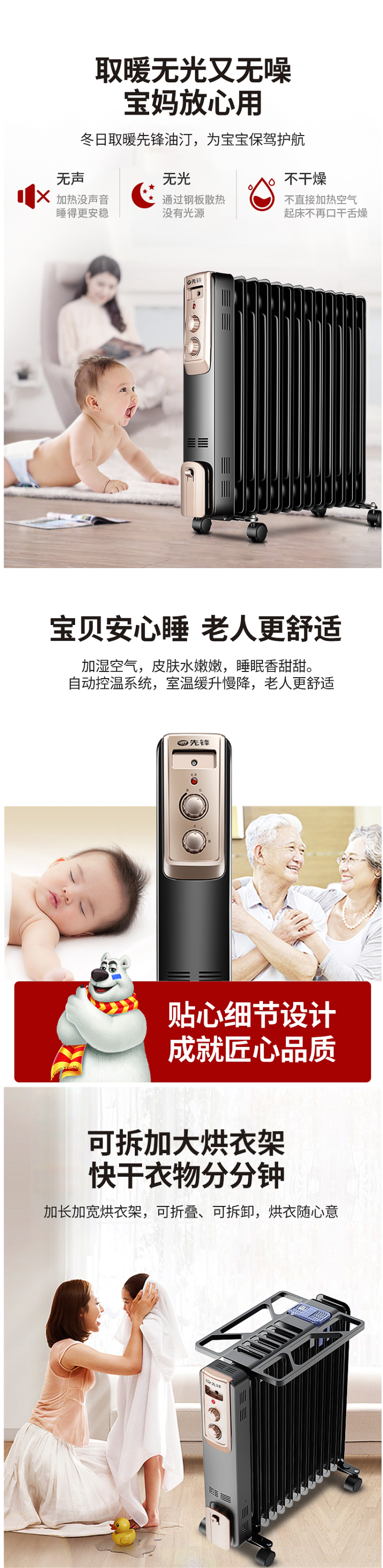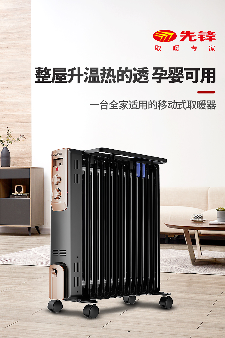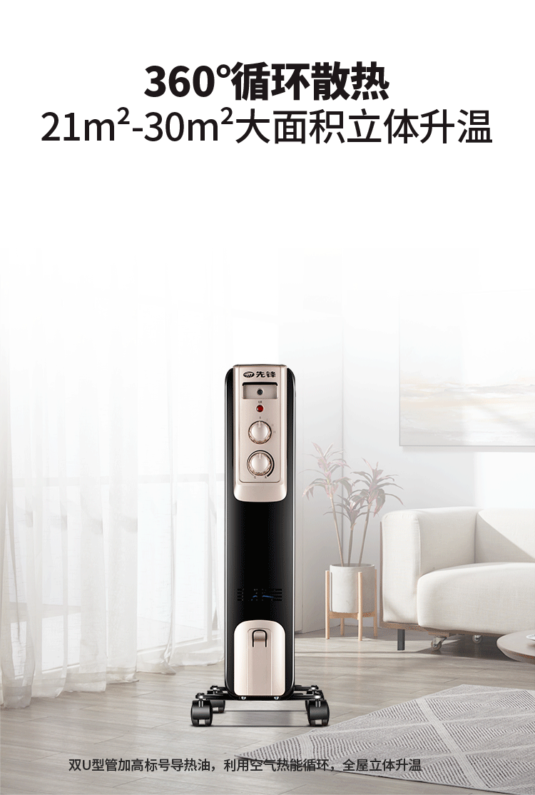 这款先锋家用油汀电暖气片,采用13片双U型发热导管设计,与油面接触面积更大,加热速度更快,短时间内实现油路升温。四重安全保护机制,智能恒温系统,最高满足30平米房间取暖需要。