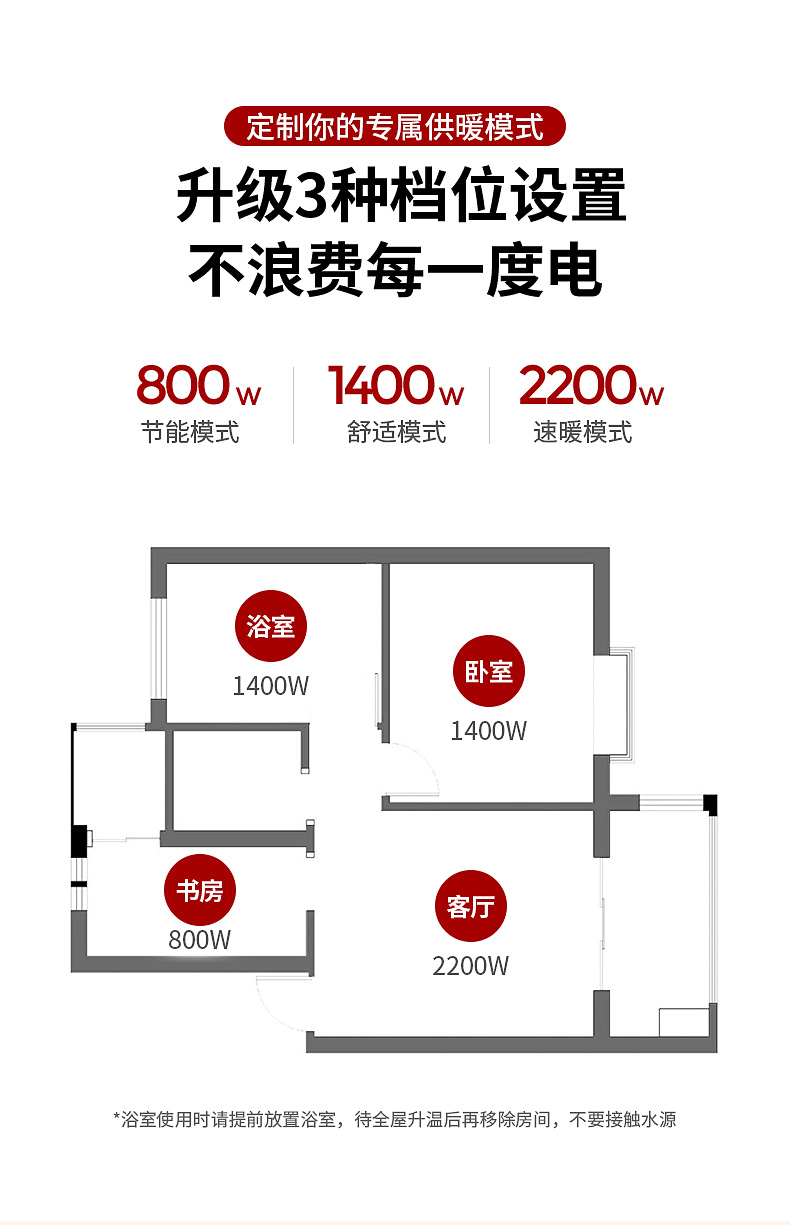 配置智能恒温系统,可调节温度按钮,设定舒适温度,保持室内温度平衡。到达温度机器自动休眠,温度降低则重新加热,节能省电。800W/1400W/2200W三档功率可调,随心设定适宜温度。