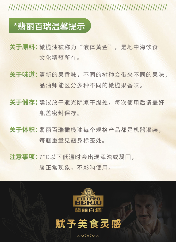 翡丽百瑞FILIPPO BERIO是意大利品牌,目前被光明集团收购(上海那个,光明牛奶就是他家的),常见的有绿瓶和黄瓶两种,绿瓶是其主打的橄榄油,产地有可能不是意大利,但是是在意大利制作,并原装进口至国内,黄瓶是混合精炼的,也是原瓶进口,品质还算说得过去。