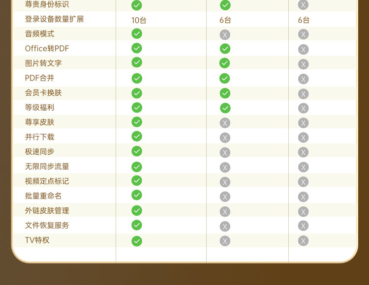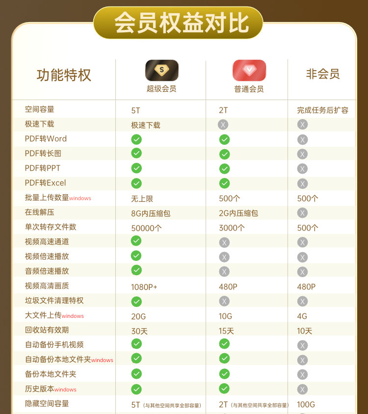 百度网盘超级VIP会员,具有5T超大容量、极速下载、无上限批量上传、转存文件5W上线,在线云解压、视频高速通道、转存上限提升、自动备份、垃圾文件清理、20GB大文件上传、30天回收站有效期、自动备份等特权。