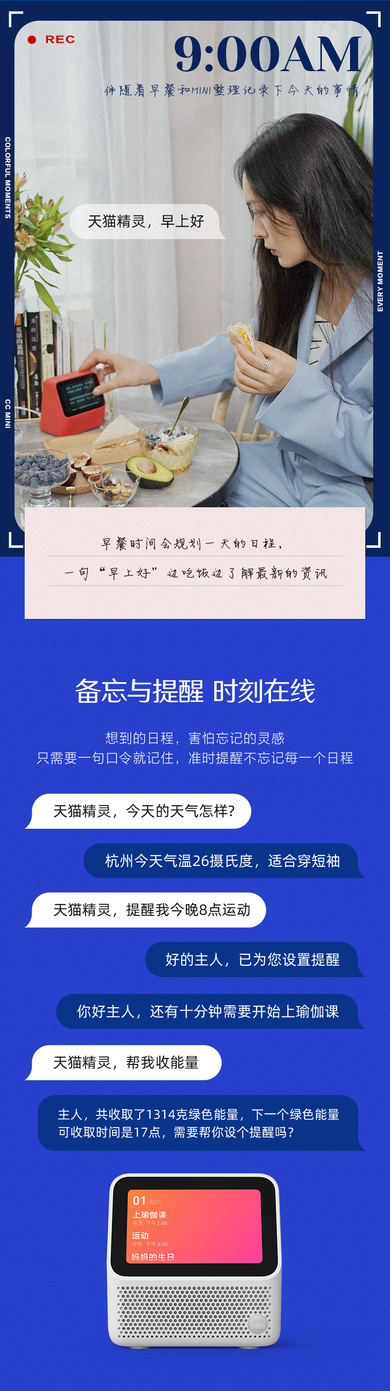 硬件方面:天猫精灵 CC MINI 智能时钟屏使用3.97英寸屏幕,800*480分辨率,支持触控操作,22度5倾角设计,配合自动光感调节亮度,带来舒适观看体验。家族式前出音设计,无风噪管,总体耐听且出色。无内置摄像头,配备可自定义功能的精灵按键,红、白潮流配色,111.6*115.3*84mm小巧精致,适合摆放在床头位置。