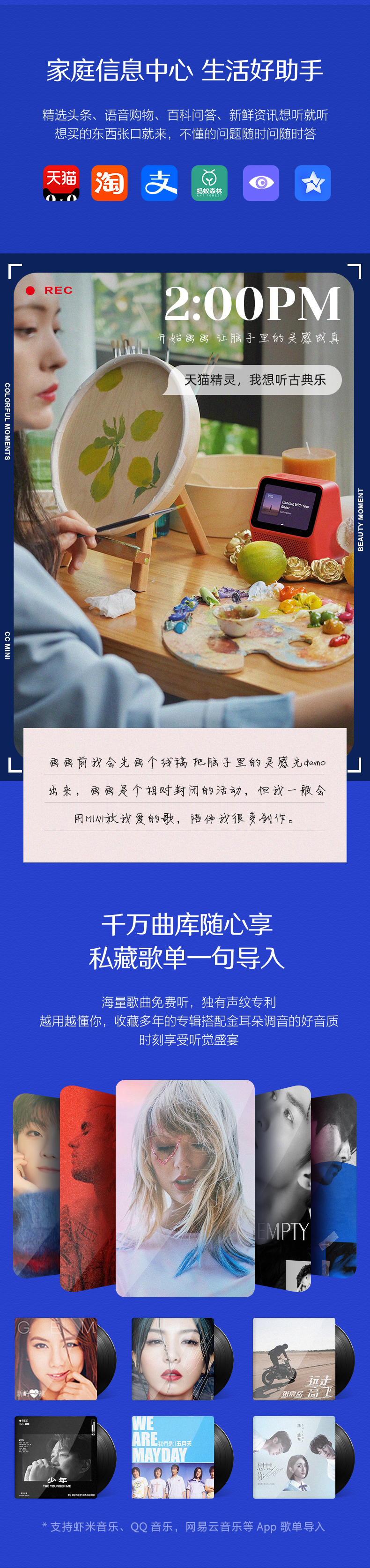 软件方面:时钟屏将持续增加的各类主题表盘,支持日程提醒、重要事项可视化。内置全功能蓝牙mesh协议栈,同时可通过Wi-Fi直连与云云对接,“天猫精灵,找队友”一句话轻松连接众多智能家居设备。超3000万首免费歌曲资源,支持QQ、网易、虾米音乐等歌单导入,拥有独有声纹专利。精灵头条、语音购物、百科问答等丰富功能,方便日常生活。