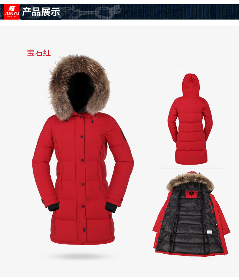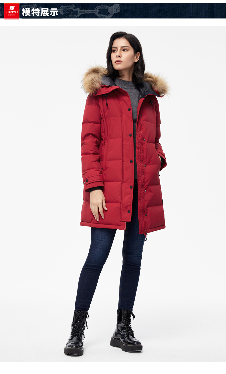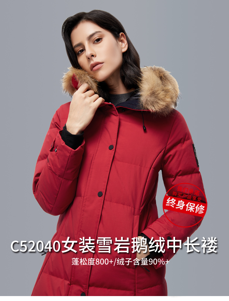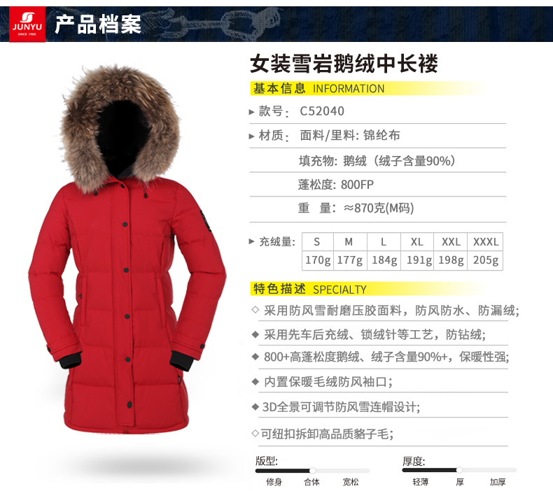 这款君羽雪岩女中长款羽绒服,属于严寒系列,可抗0℃~-15℃,是2018年的冬季款,内里填充了800蓬90%鹅绒,M码充绒177克,属于中厚款羽绒服,外层是高密度耐磨锦纶布,伴有压胶加持,可防风防雨雪。直筒微收腰版型,长度过臀及大腿。