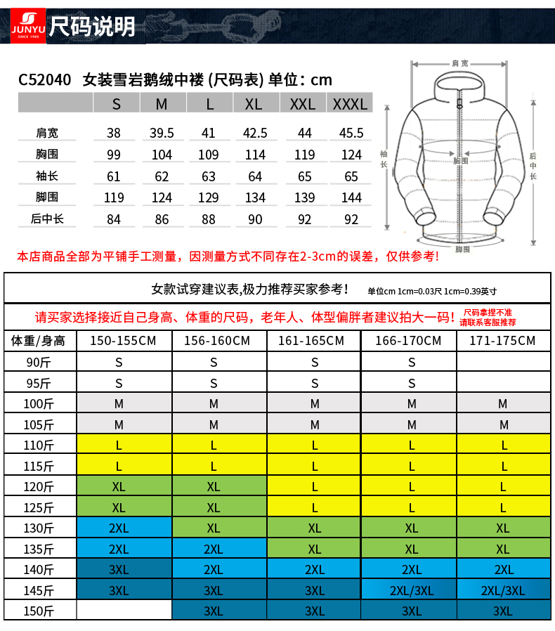 充绒量为:S码170克、M码177克、L码184克、XL码191克、XXL码198克、XXXL码205克