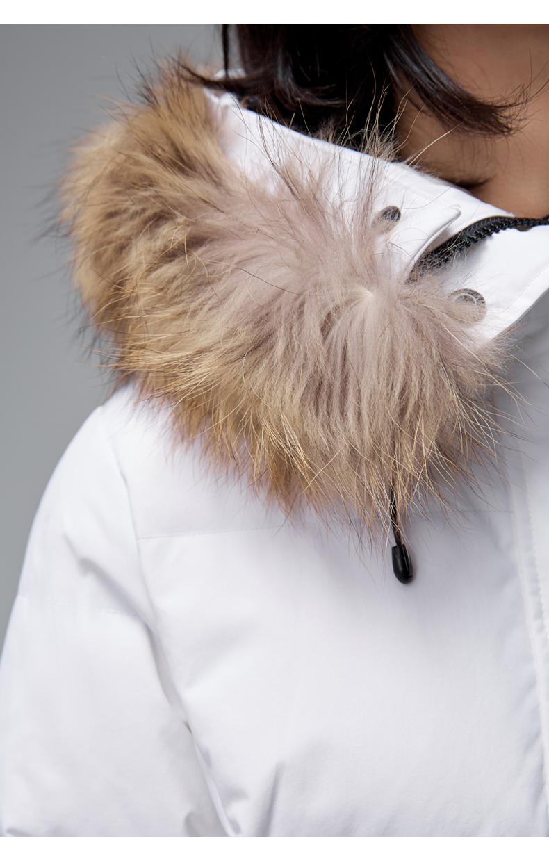 在款式和细节方面,修身版型,羽绒服是连帽设计,帽檐一圈可拆卸的大貉子毛领,亲肤柔软无刺激。双头主拉链和纽扣组合的双门襟,有着更好的保暖效果,所有拉链都是YKK的;双层防风保暖袖口,内里是弹力针织面料拼接,能很好的贴合手腕,保暖防风。