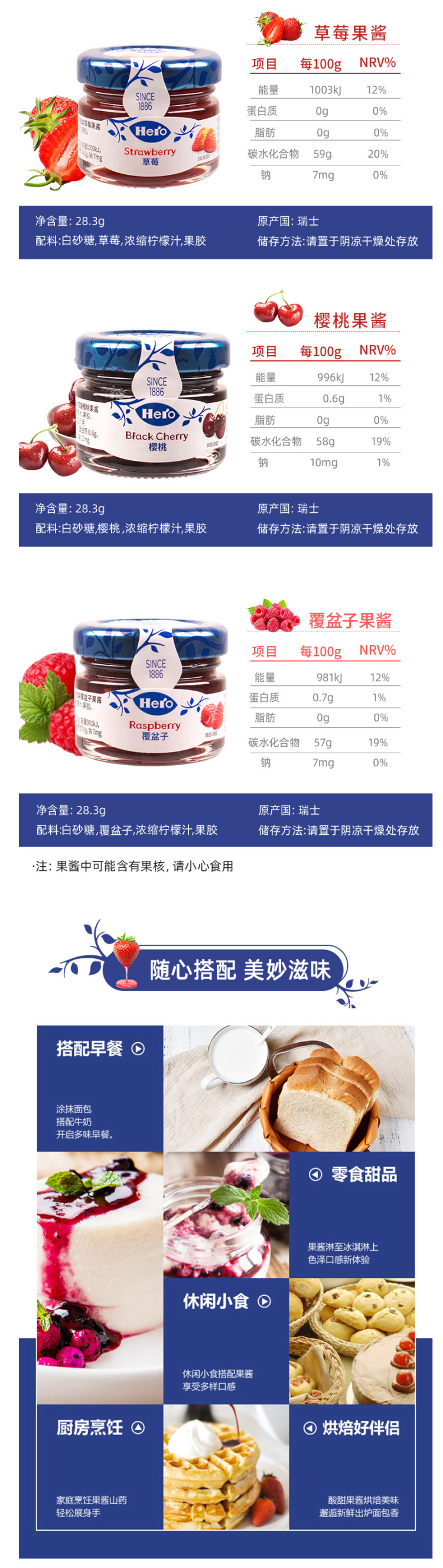 果酱产自瑞士,果酱的原料主要来自美丽的欧洲果园,哪里气候湿润,空气清新,干净的水和未受到污染的土壤,大大提高了水果的鲜美和营养,使我们的果酱香甜、果香浓郁,味道鲜美。