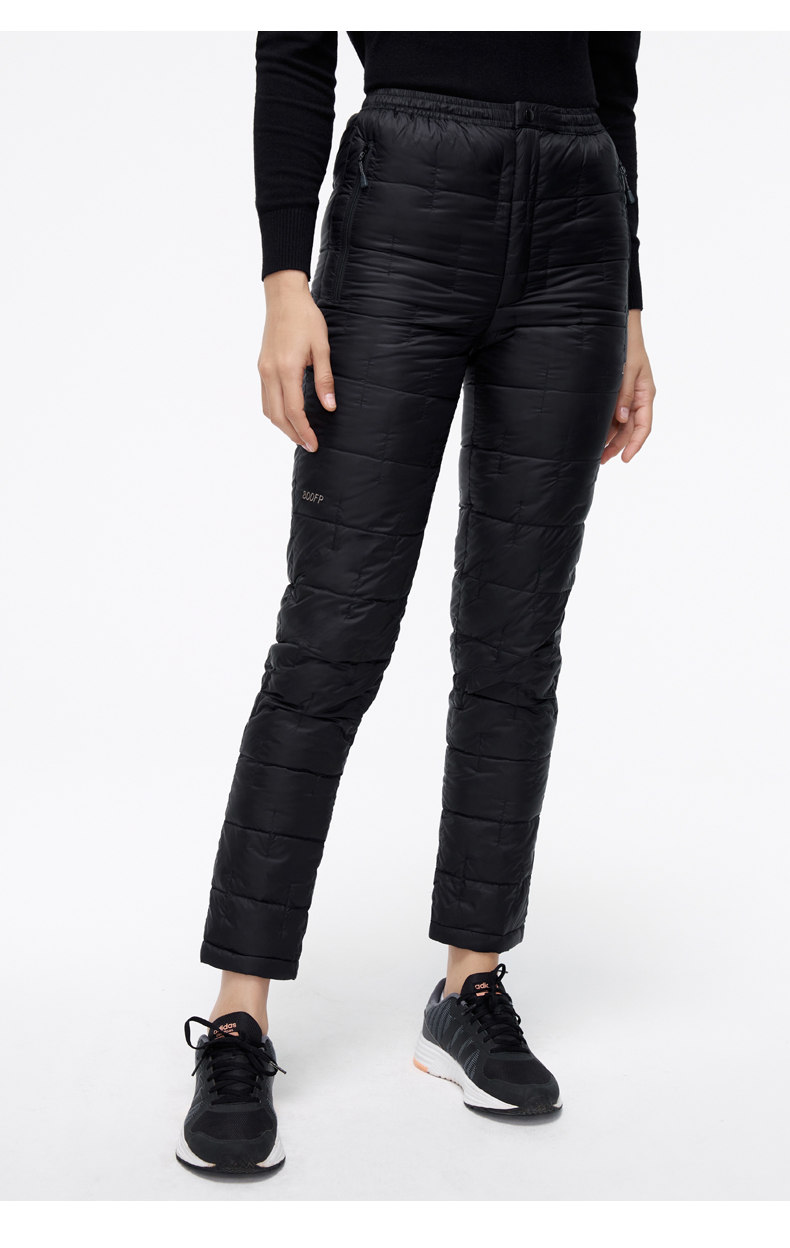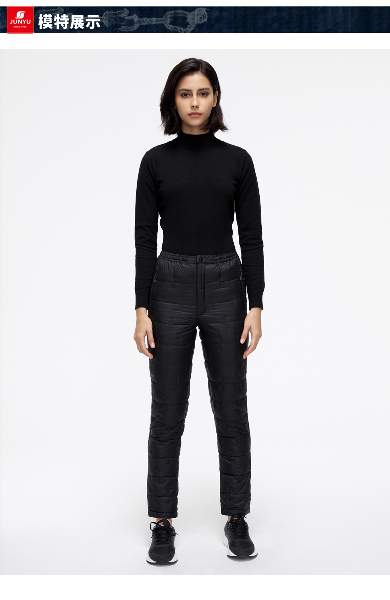 这款君羽男女羽绒裤,外层是日本东丽20D高密尼龙面料,防风防泼水,内里填充800蓬90%鹅绒,常规款充绒量55克,厚款充绒量73克,可以穿的轻便又暖和。