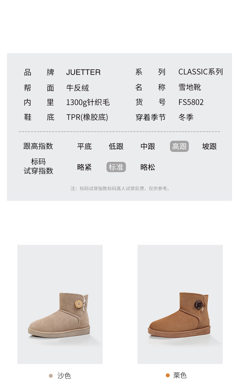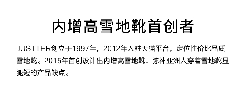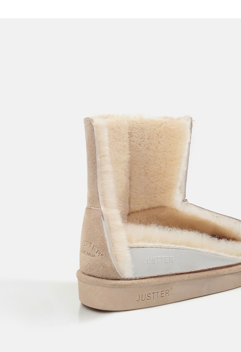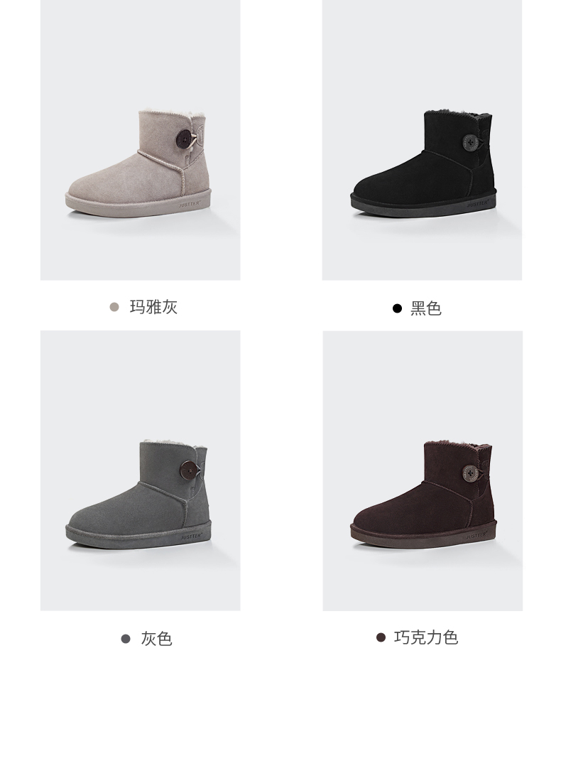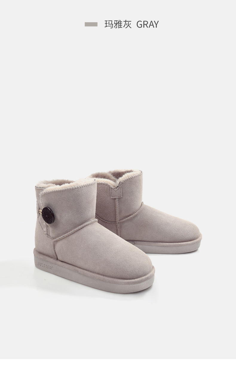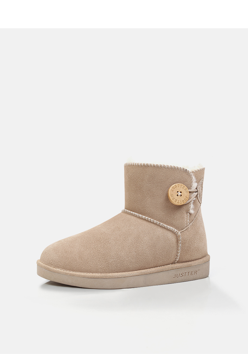 这款JUSTTER女内增高雪地靴,是2021年的新品,经典雪地靴造型,鞋面是用牛反绒皮制成的,同时运用纳米防水技术处理,无惧泼水,雨天也能照穿。内里是1300g加厚加长针织绒毛,柔软保暖。